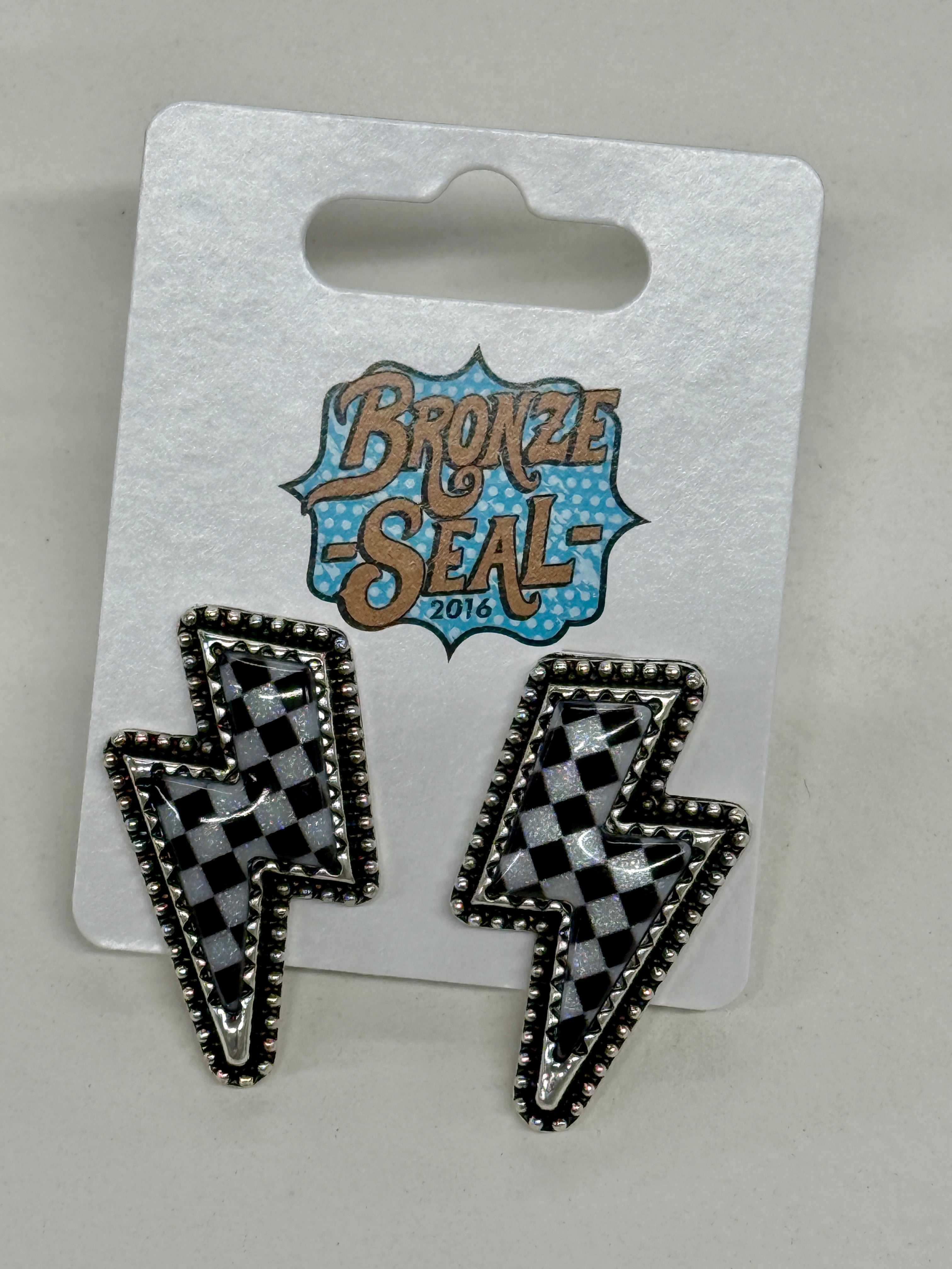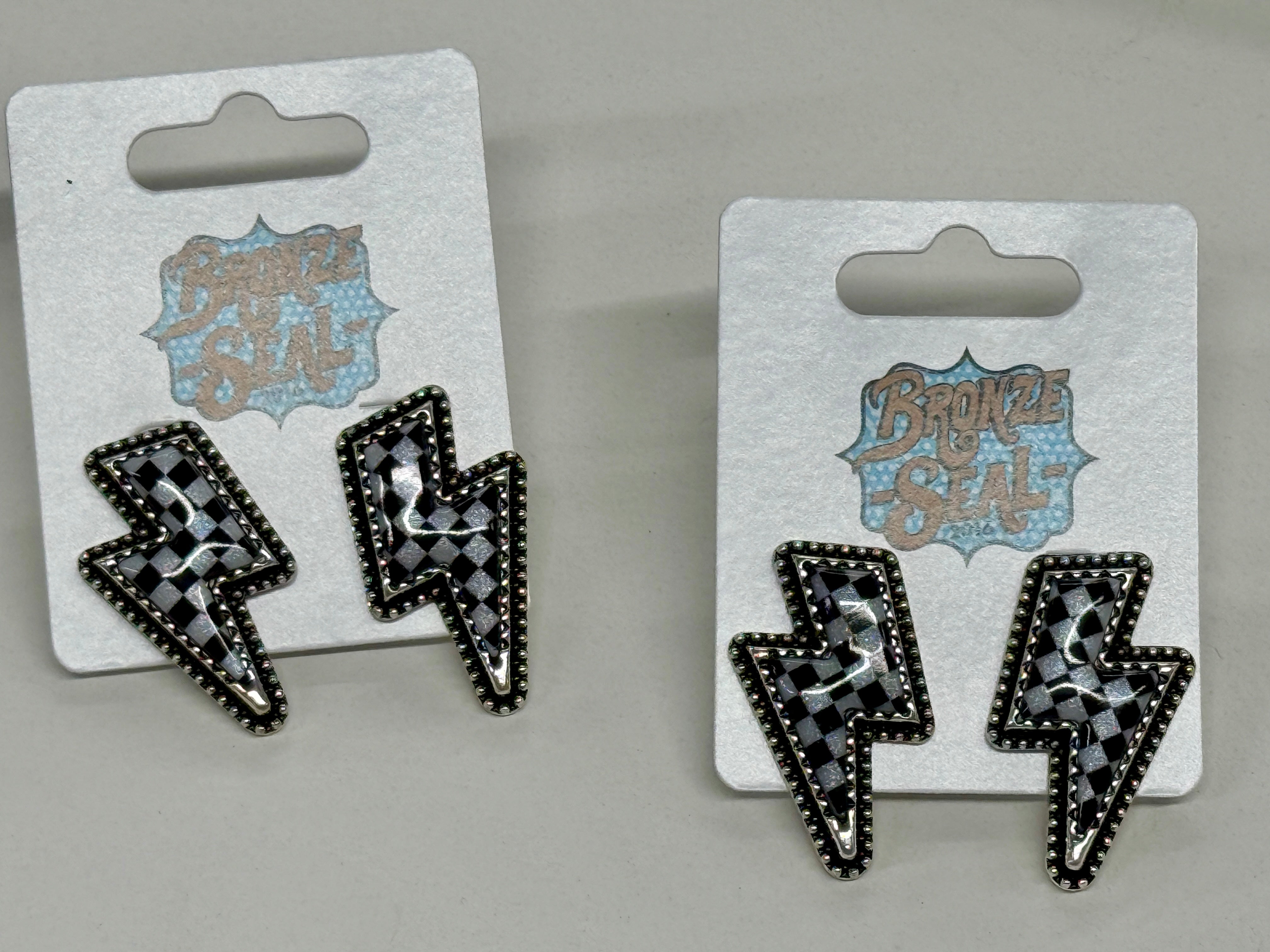 Super cute and trendy black and white checker thunder bolt stud earrings.