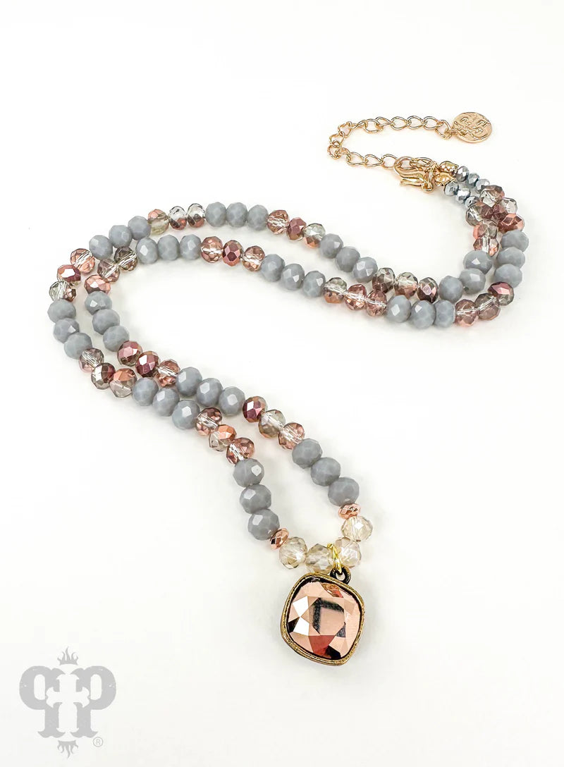 This necklace has gray and gold beads. The pendant is a 12mm rose gold Austrian crystal drop in a setting custom made for Pink Panache in the USA. Approximately 16 inches in length.
