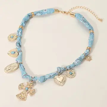 Turquoise Boho Cross Heart Charm Fabric Braided Necklace