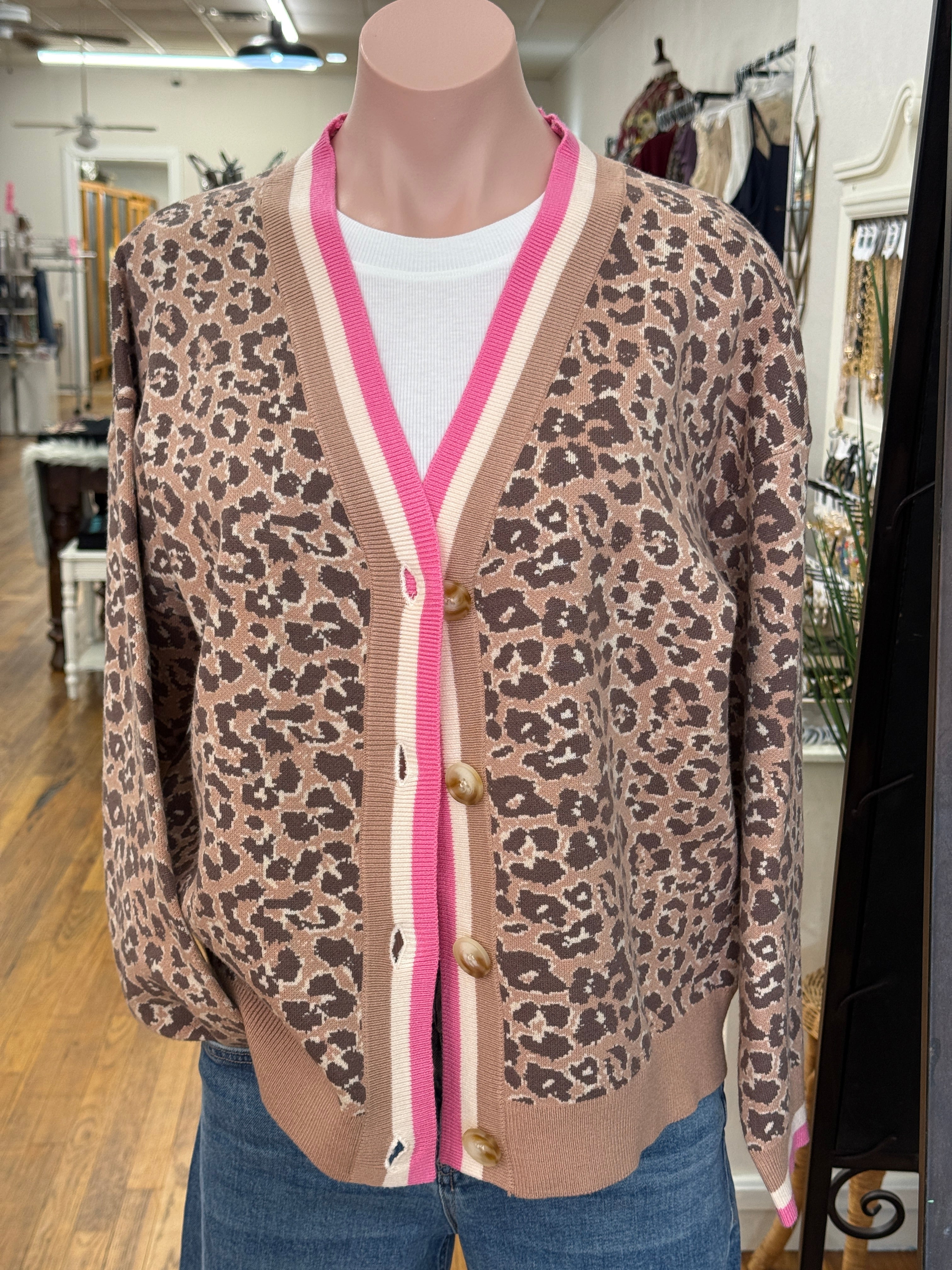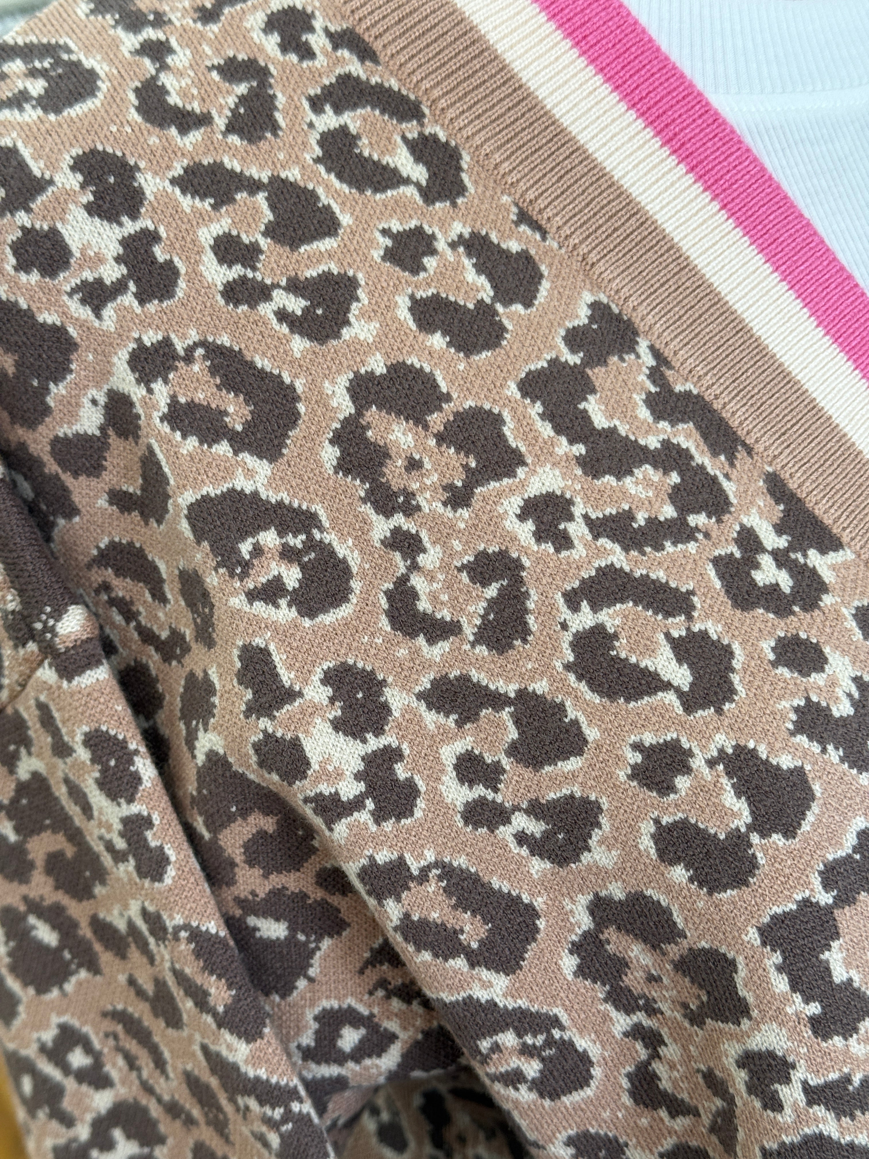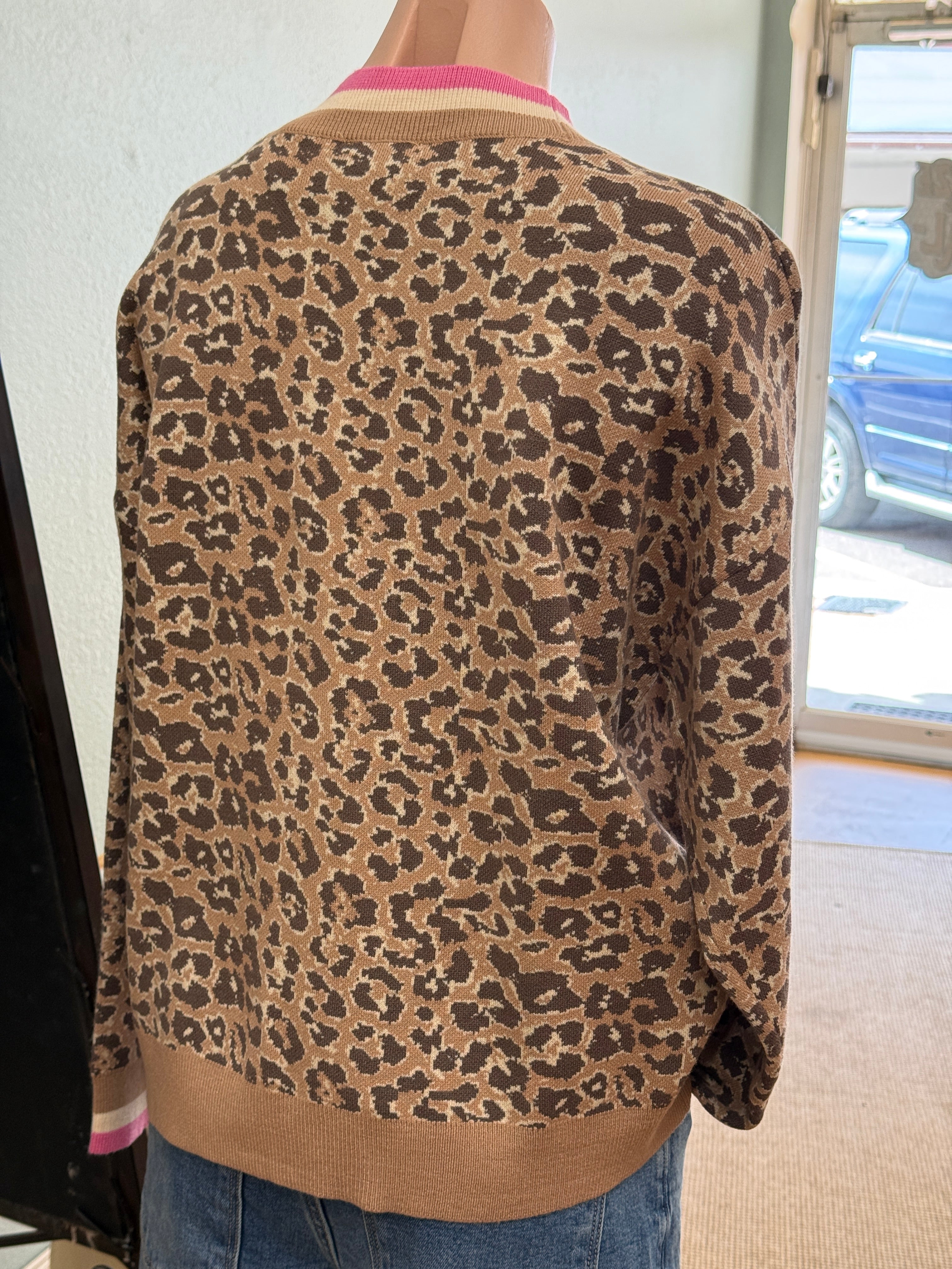 Animal pattern long sleeve v-neck button front closure cardigan featuring multi-color athletic stripe ribbed detail.