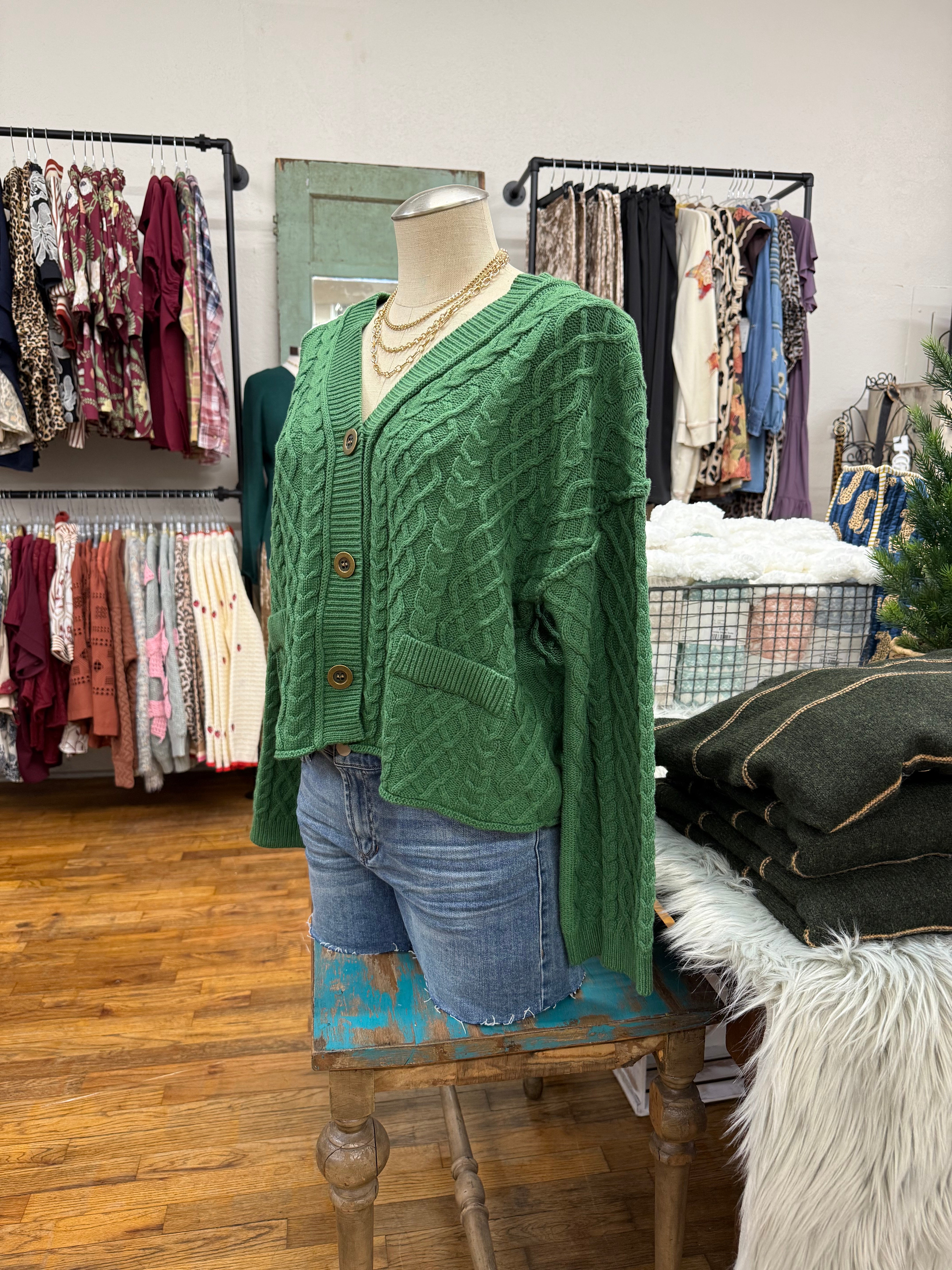 Forest green relaxed fit v-neck cable knit sweater cardigan.