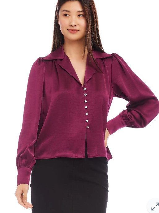 Elegant satin blouse with button-up front. Rich navy and burgundy colors.
