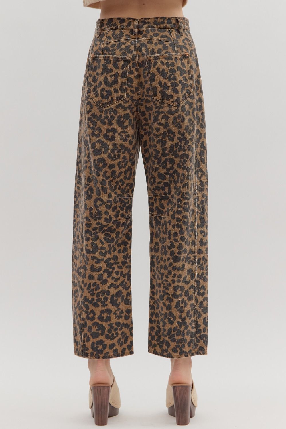 Leopard pattern ankle-length pants. Button fly-front zipper closure. Pockets at sides and back patch pockets.