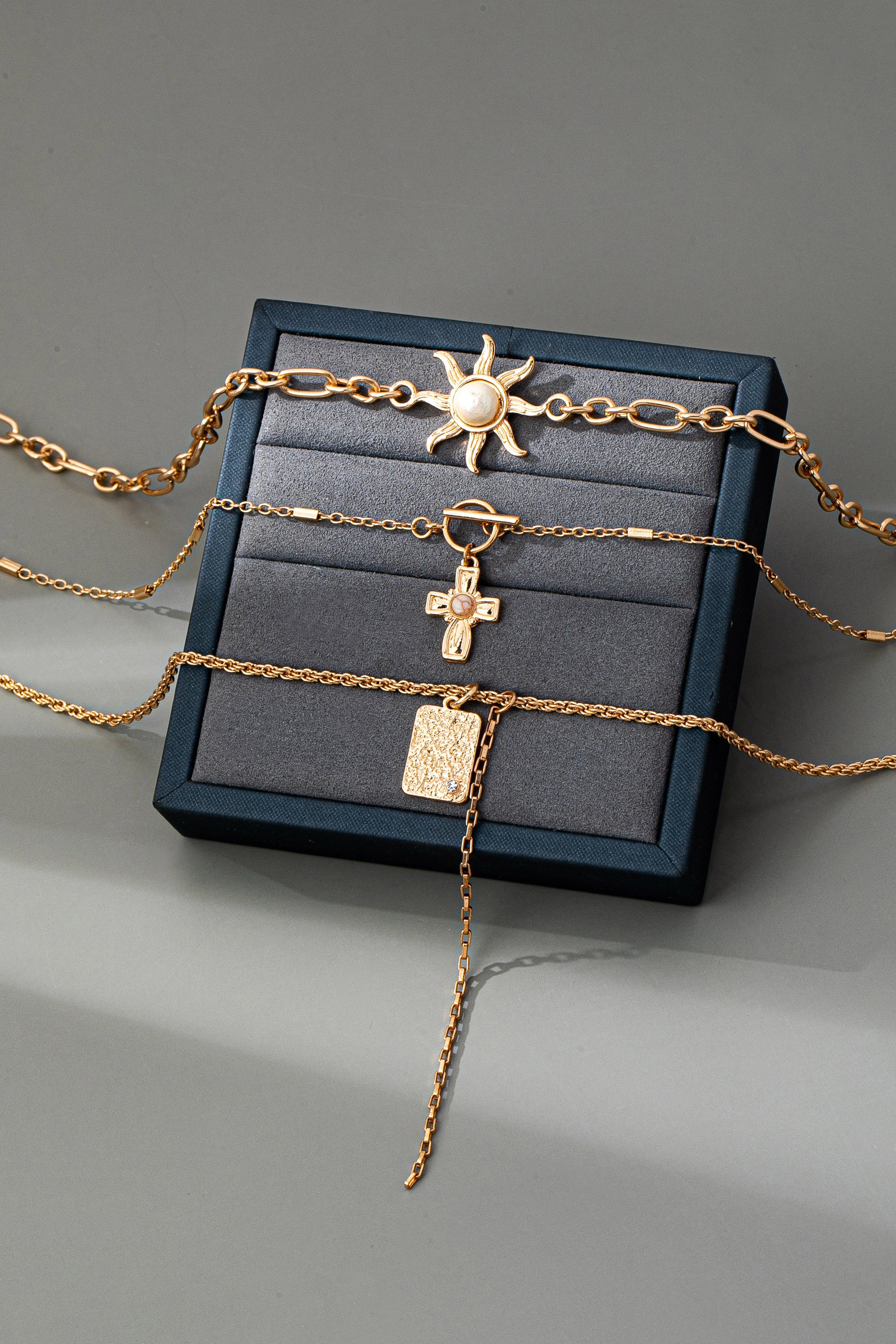 chains including a radiant sunburst with a pearl center, a cross toggle