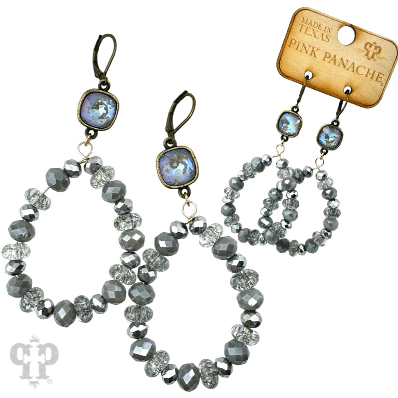 This earring has a teardrop made of faceted crystal and saucer beads of different sizes. The teardrop hangs from a 10mm Austrian crystal connector in a setting custom made for Pink Panache in the USA with a lever back for ease of wear.