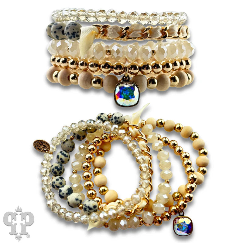 This mixed bead bracelet set has five strands. Each strand is different and there's a mix of faceted glass beads, ribbon and gold tone beads. The charm is an Austrian crystal in a setting custom made for Pink Panache in the USA.