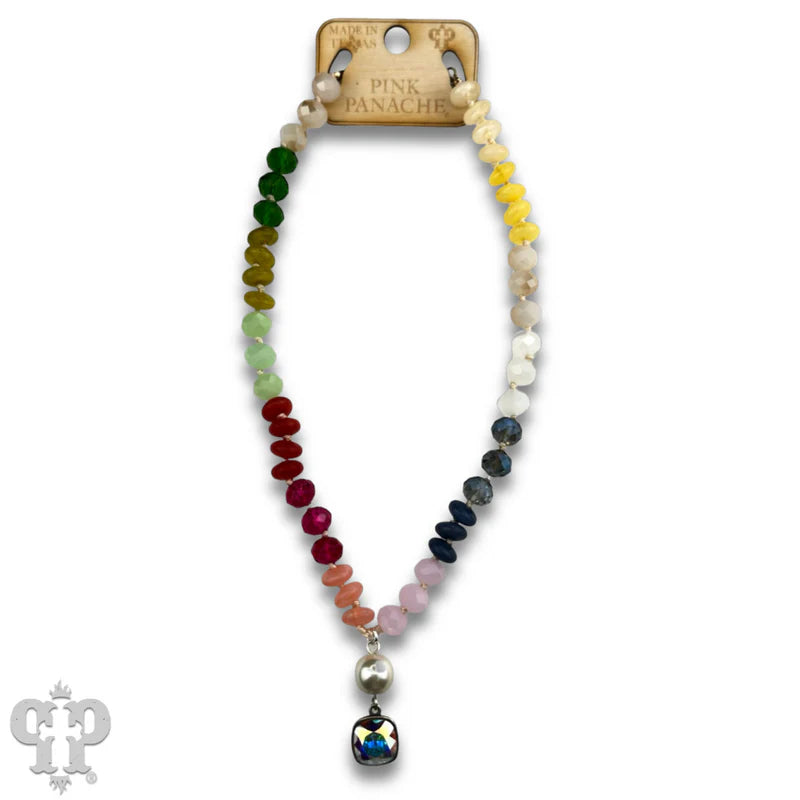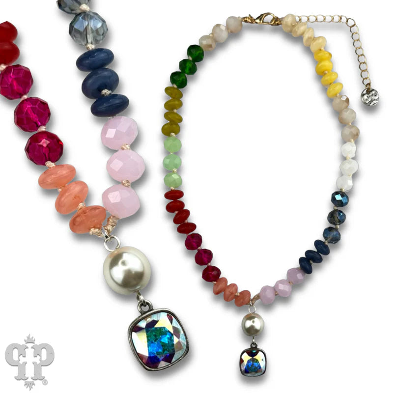 This necklace has faceted and saucer beads knotted on thread. The cream pearl accent connects a 12mm Austrian crystal in a setting custom made for Pink Panache in the USA.