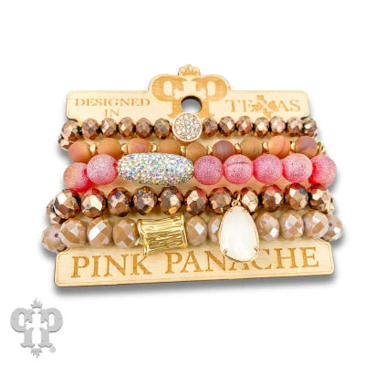 This bracelet has five strands of stone, crystal and rhinestone beads with charms. It stretches for ease of wear.