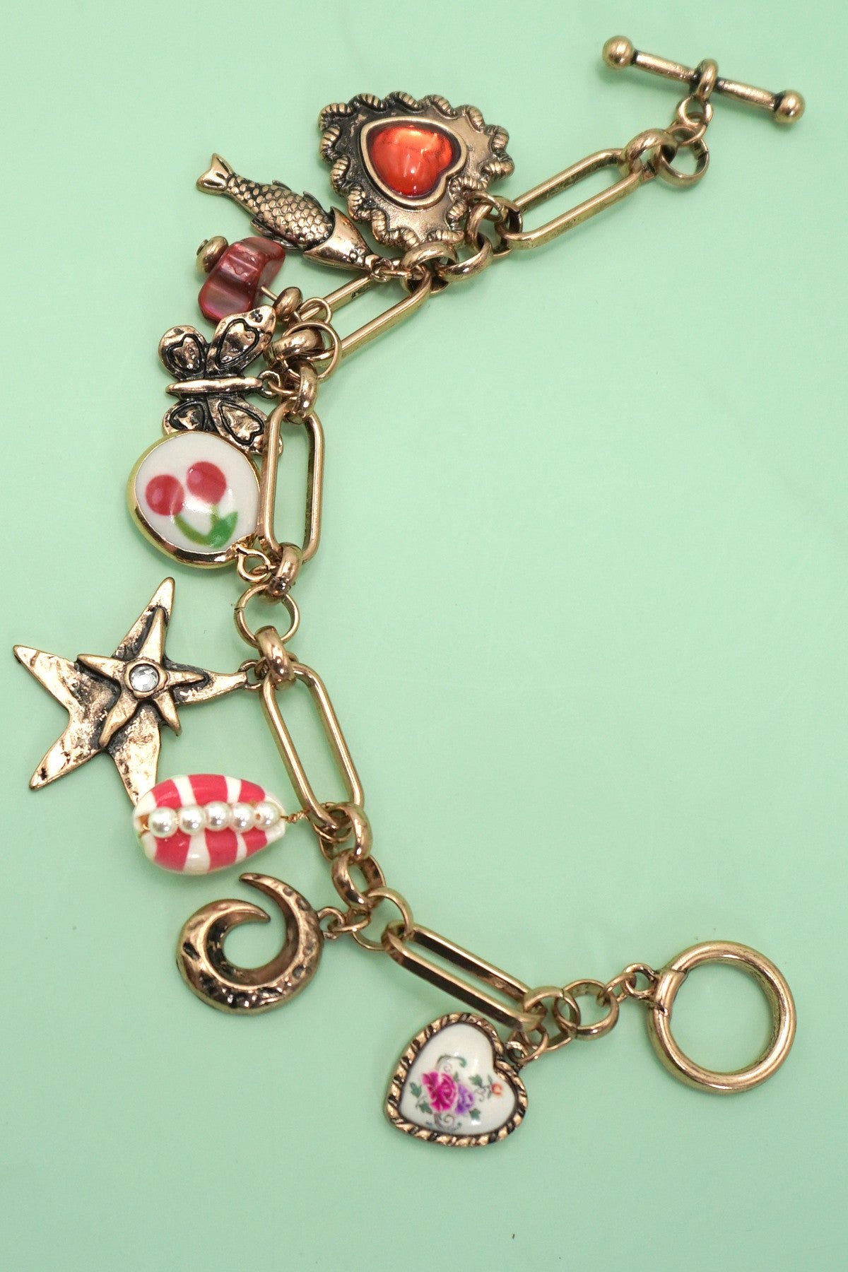 gold link toggle chain. Mix of porcelain gem accents, hearts, sweet cherry