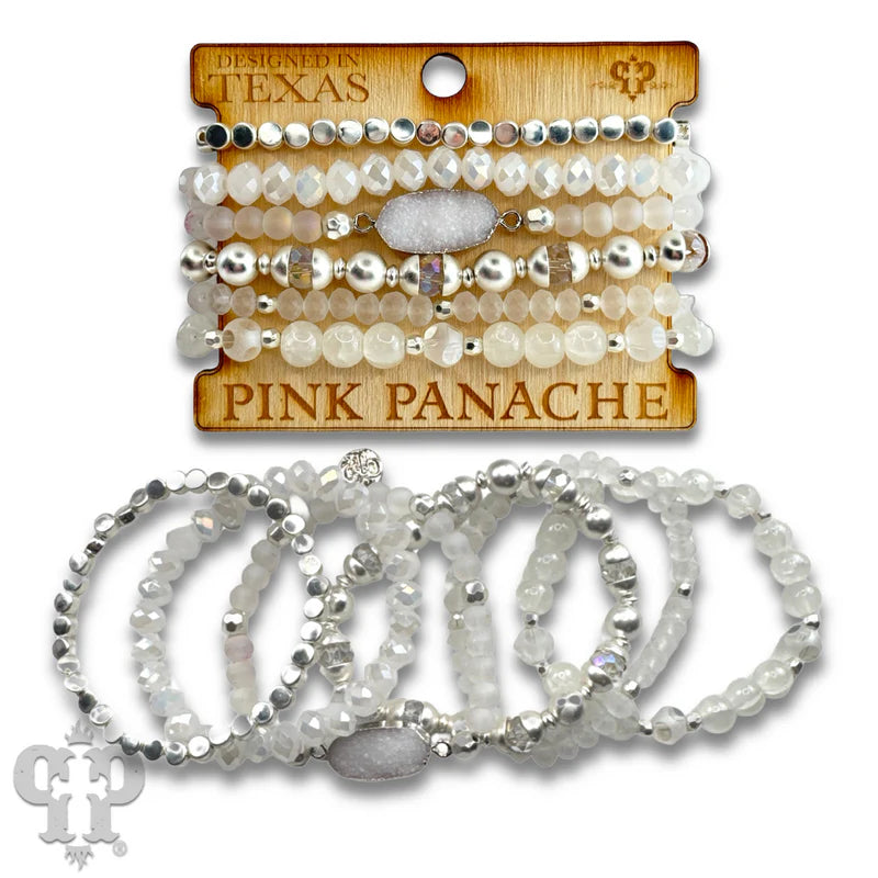 This bracelet has a faceted, round and flat beads in different sizes mixed into six strands. It features a druzy charm and stretches on and off for ease of wear.