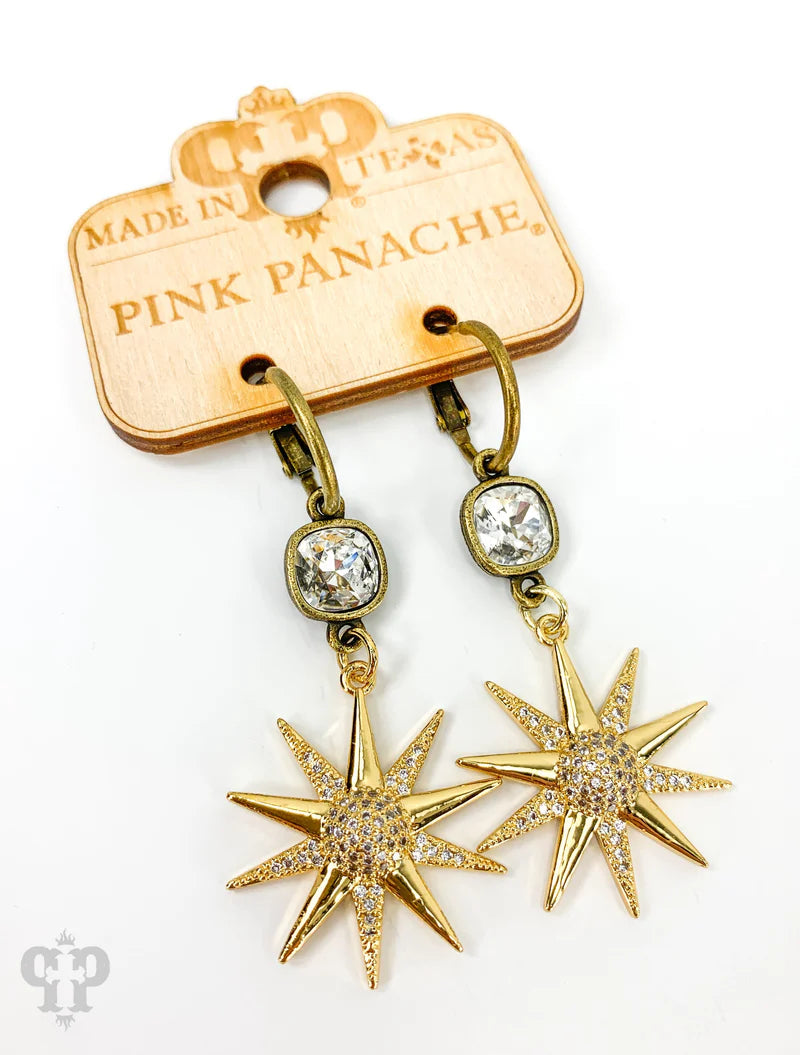This earring features a gold pave starburst. It hangs from an 8mm clear Austrian crystal, in a setting custom made for Pink Panache in the USA, and mini hoop. Approximately 2 inches in length.