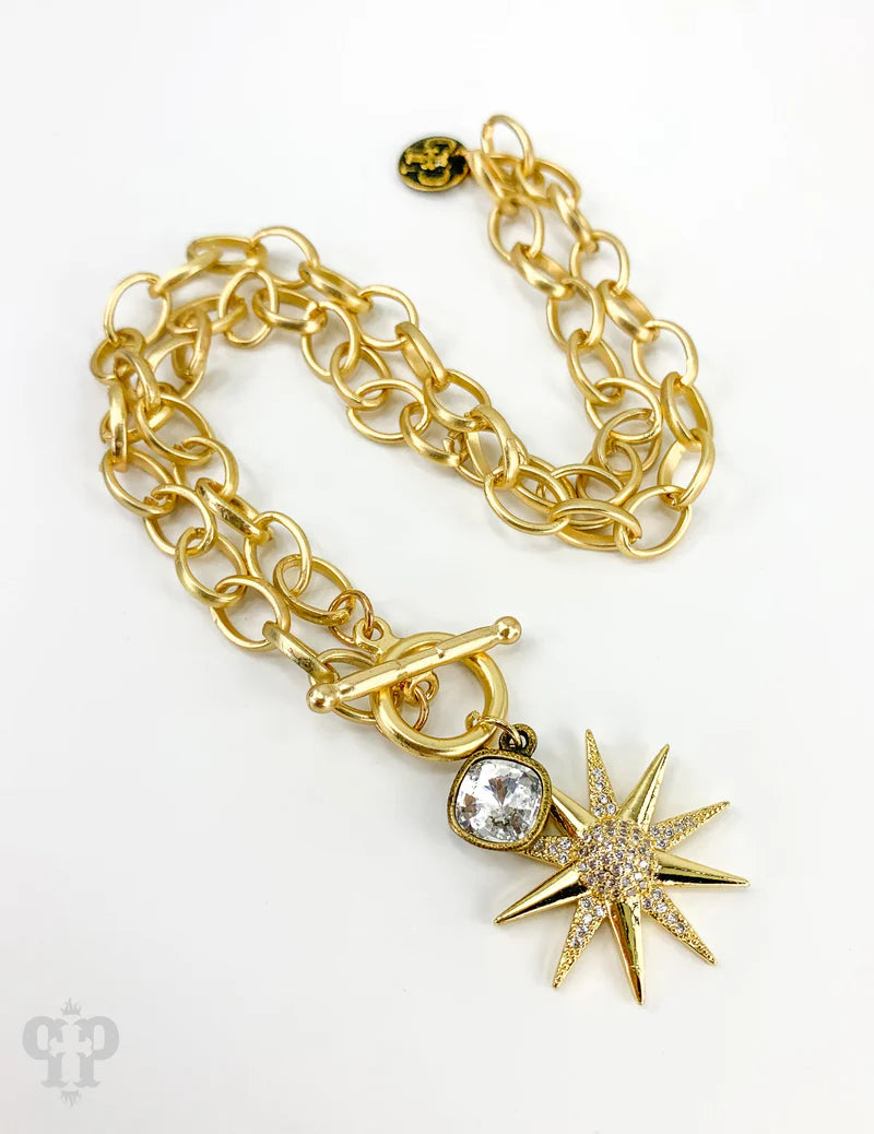 This matte gold toggle front chain has a pave rhinestone starburst pendant.  In addition to the starburst there is an 8mm Austrian crystal drop in a setting custom made for Pink Panache in the USA.  Approximately 16 inches in length with a toggle closure.