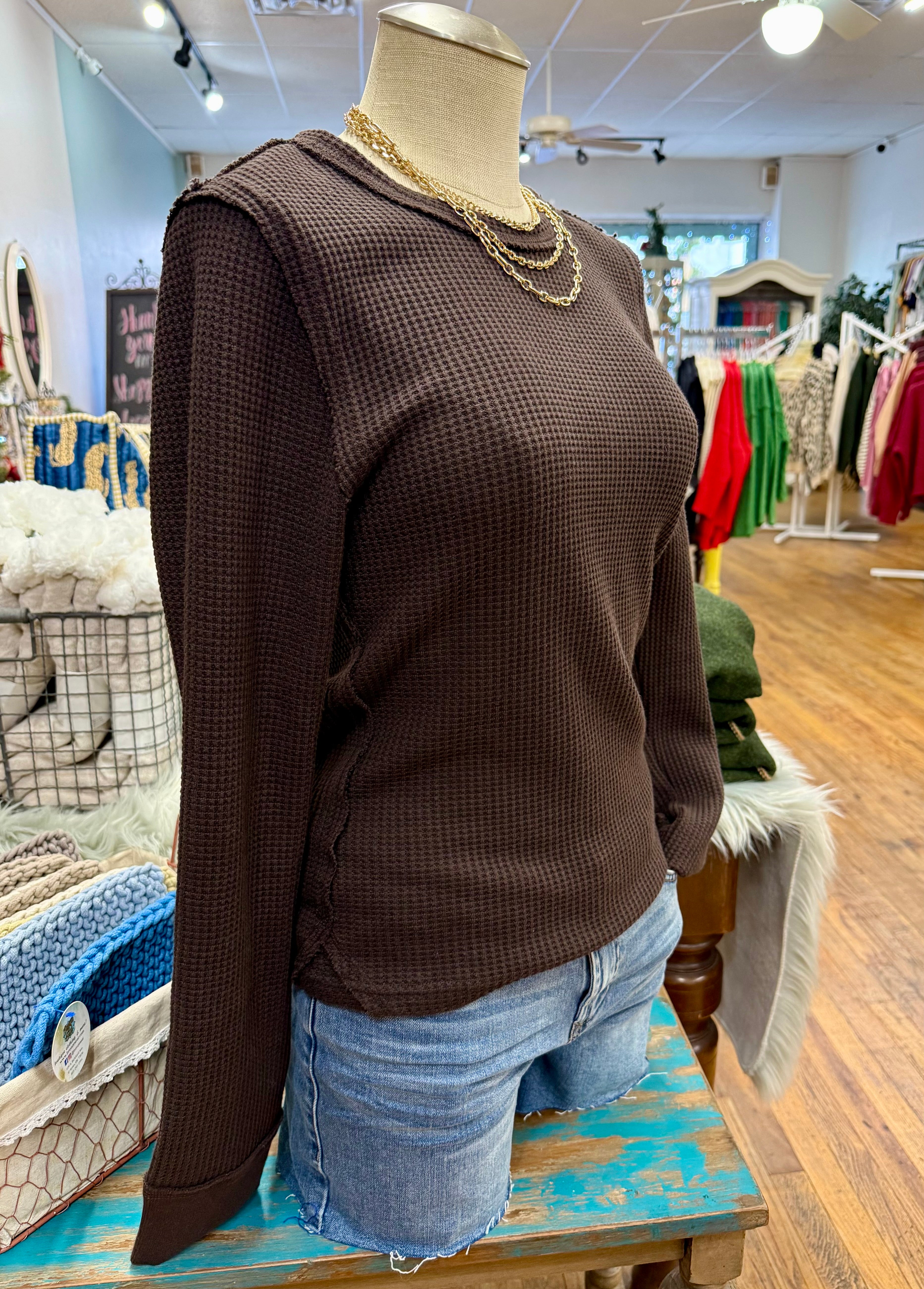 Its waffle texture adds a subtle touch of modernity, ideal for layering or wearing solo, this top is your go-to solution for a versatile outfit that exudes understated lifestyle wear.