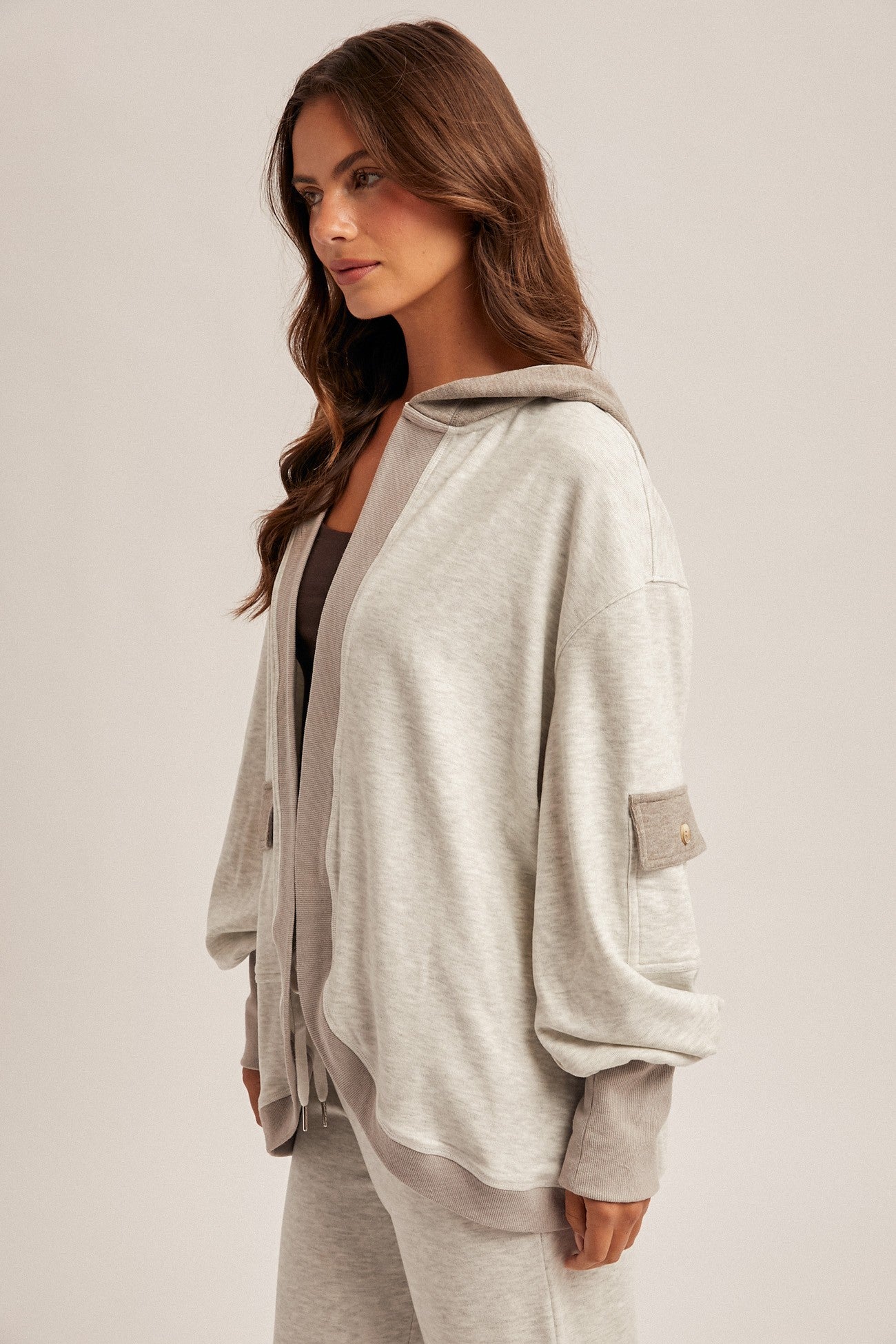 Super soft and cozy light heather grey color block hooded cardigan. Easy to pair with jeans, leggings or sweatpants.