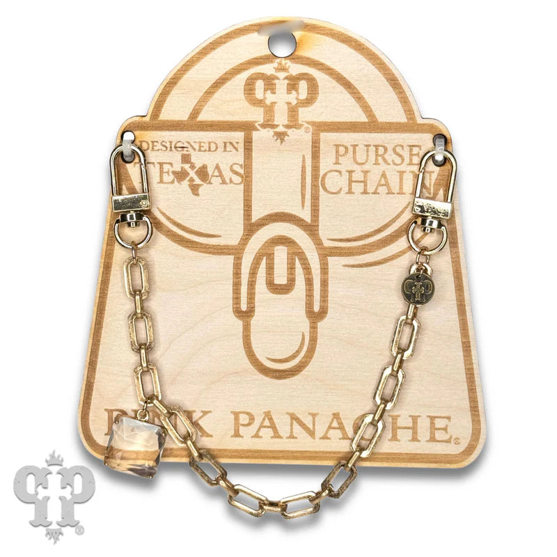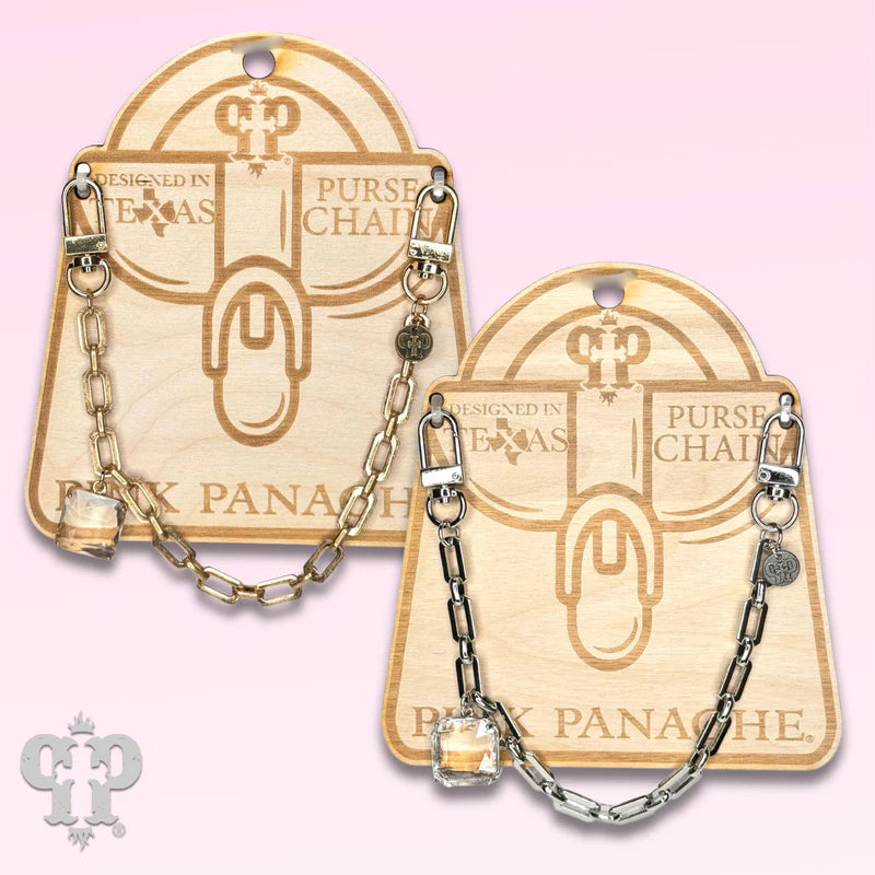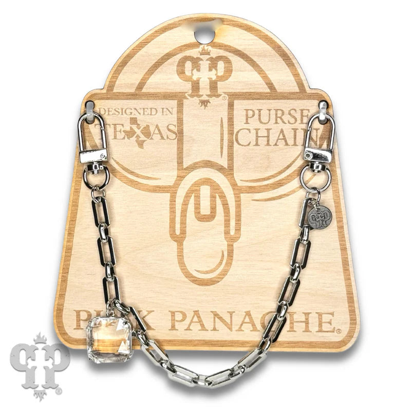 This purse chain has a single strand of square link with a clear, square and prong set crystal drop. The clasp is a swivel hook making it easy to attach to most purses, bags or backpacks.