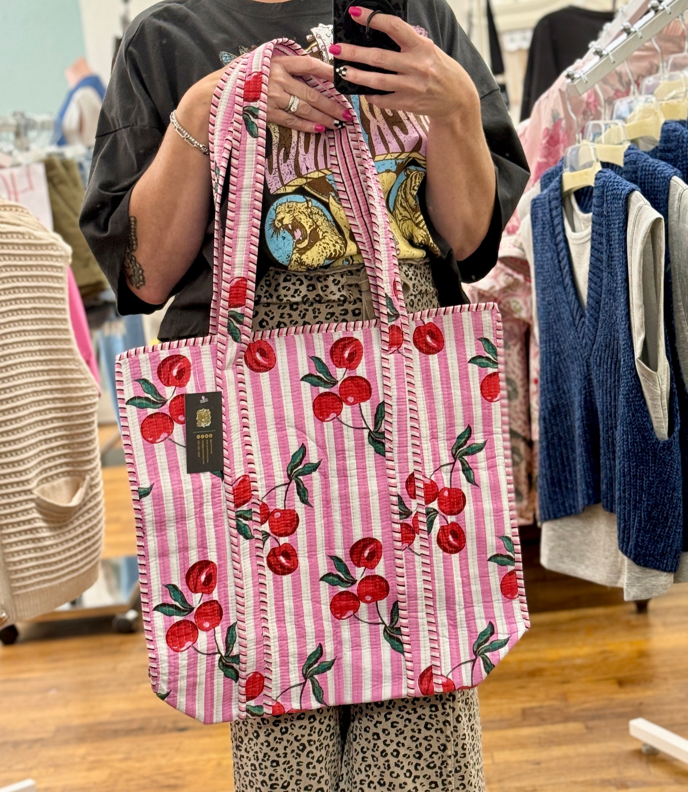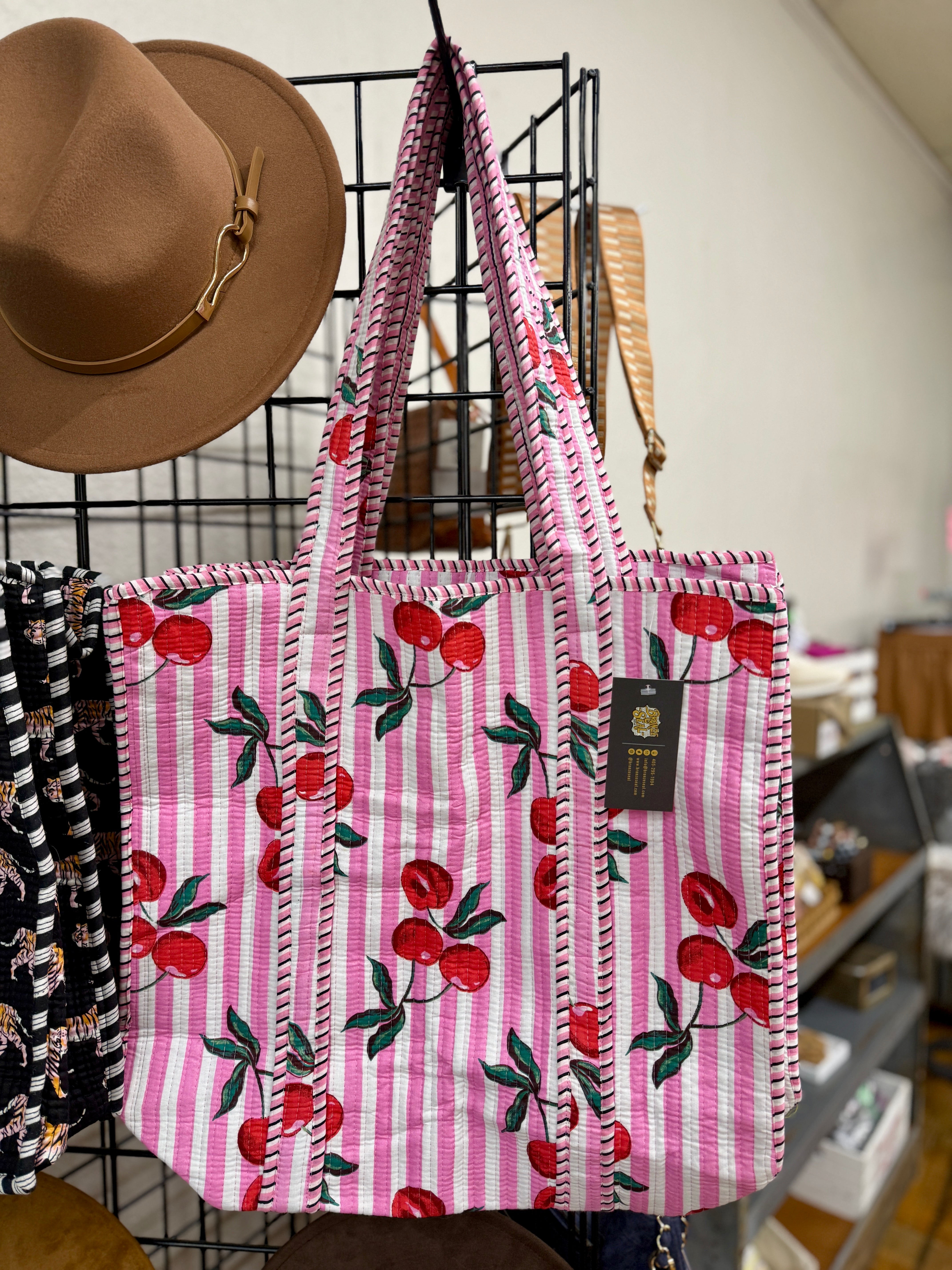 Meet your new go-to tote: bold, beautiful, and effortlessly chic. This quilted carryall features fun and trendy cherries on a pink and white stripe quilted tote. Whether you're heading to brunch, the bookstore, or a weekend getaway, this bag brings just the right mix of flair and function.