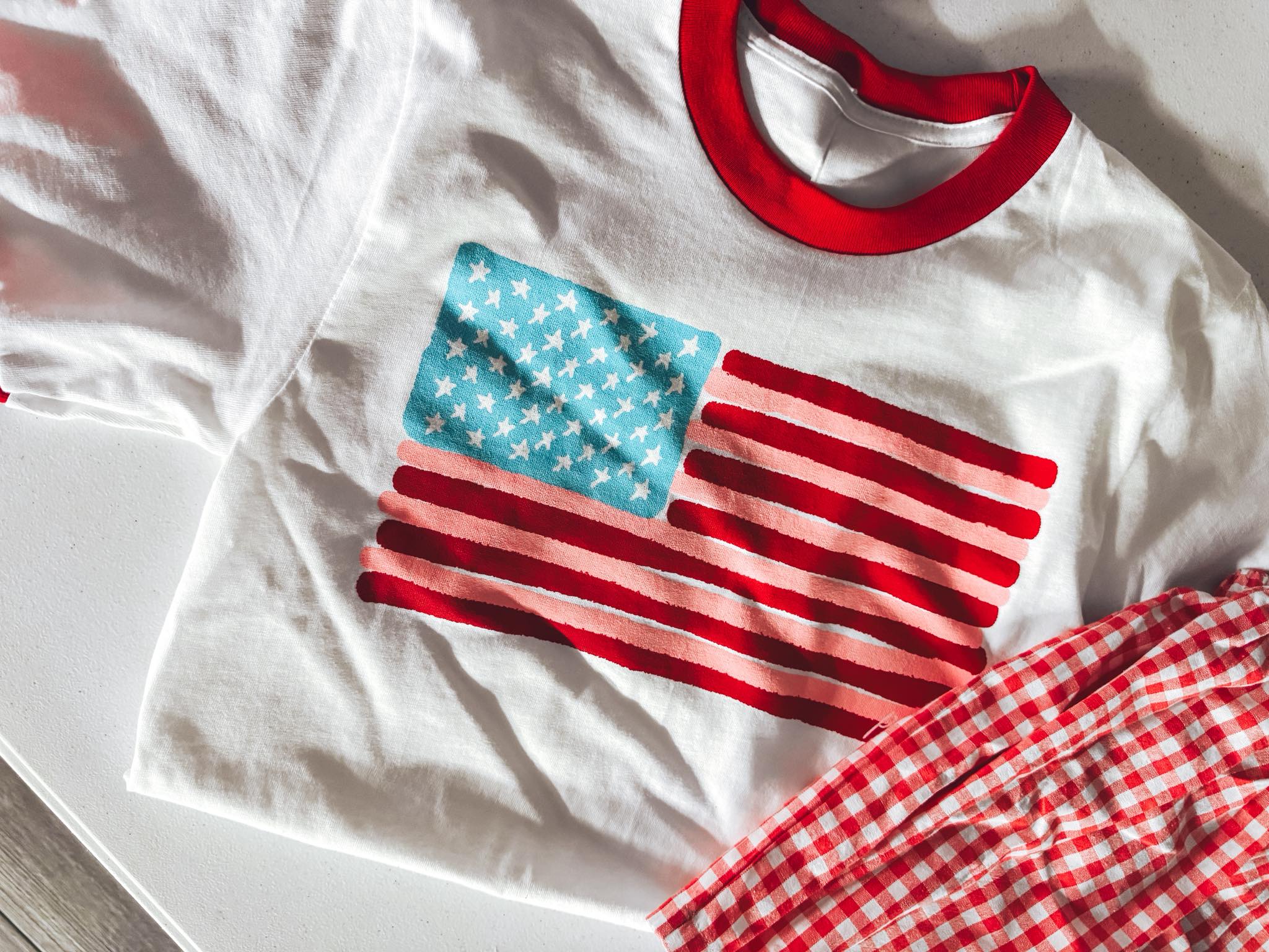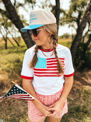Add a pop of patriotic fun to your wardrobe with the Flag Ringer Tee! This playful ringer tee is comfy and stylish, perfect for wearing anytime you want to show off a little USA pride with a casual twist.
