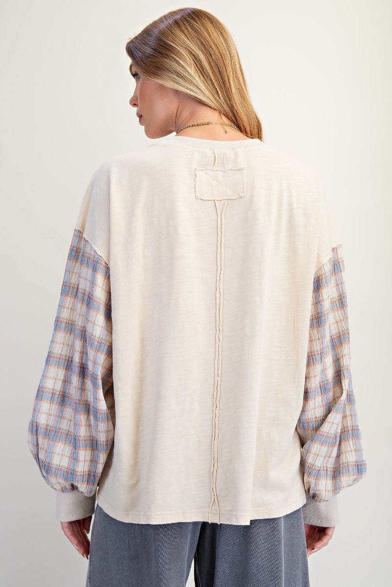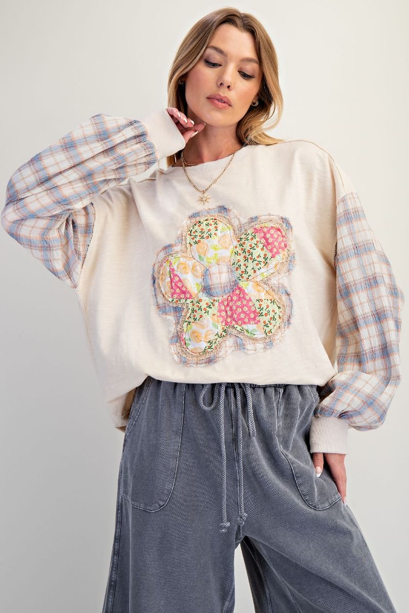 This top is super cute with flower patch front and plaid sleeves. The colors are great with some pops of color adding to the neutral body.