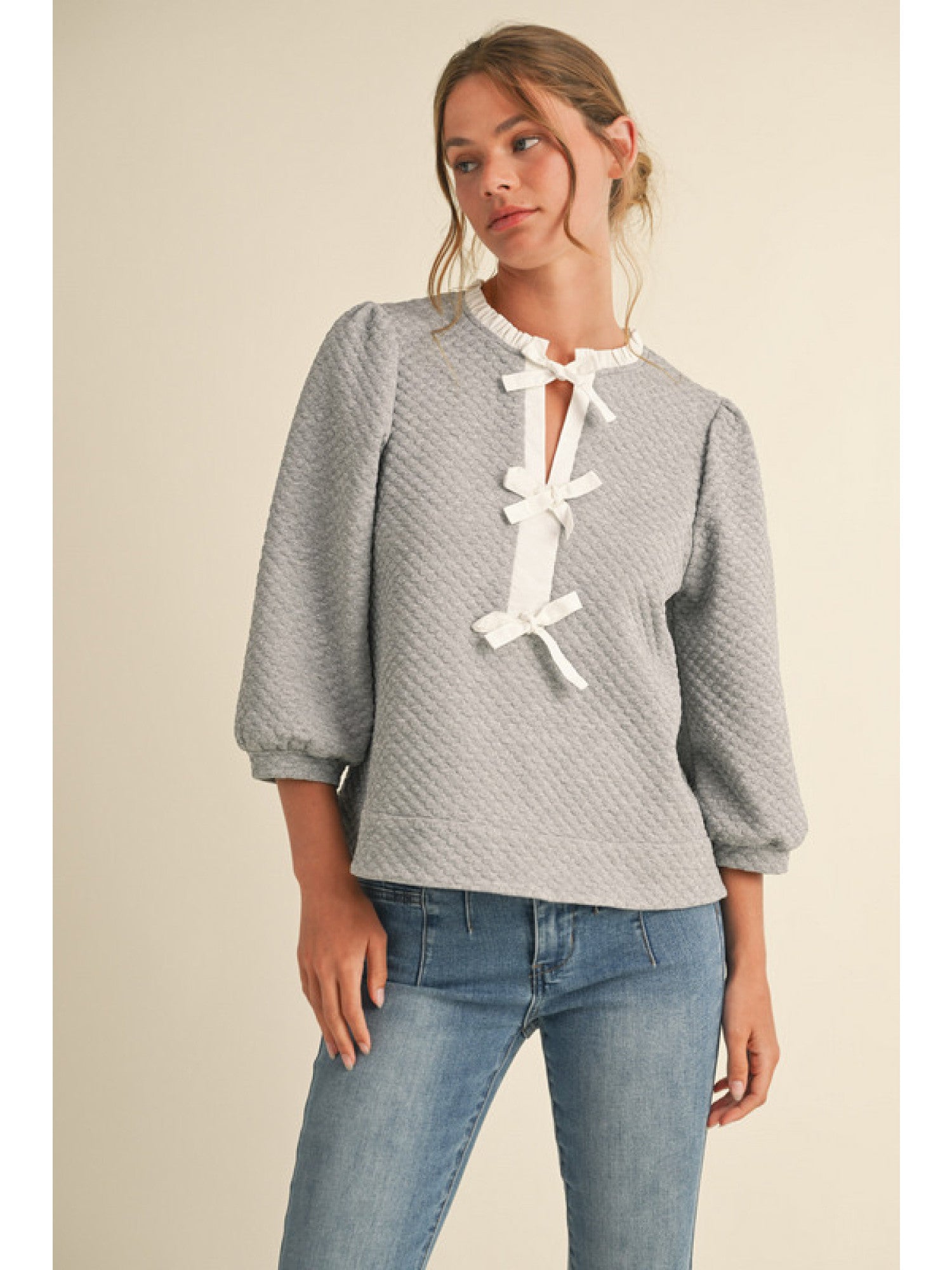 Embossing textured top with frilled neck features bow ties, three quarter bubble sleeves, band cuffs, and vented hemline