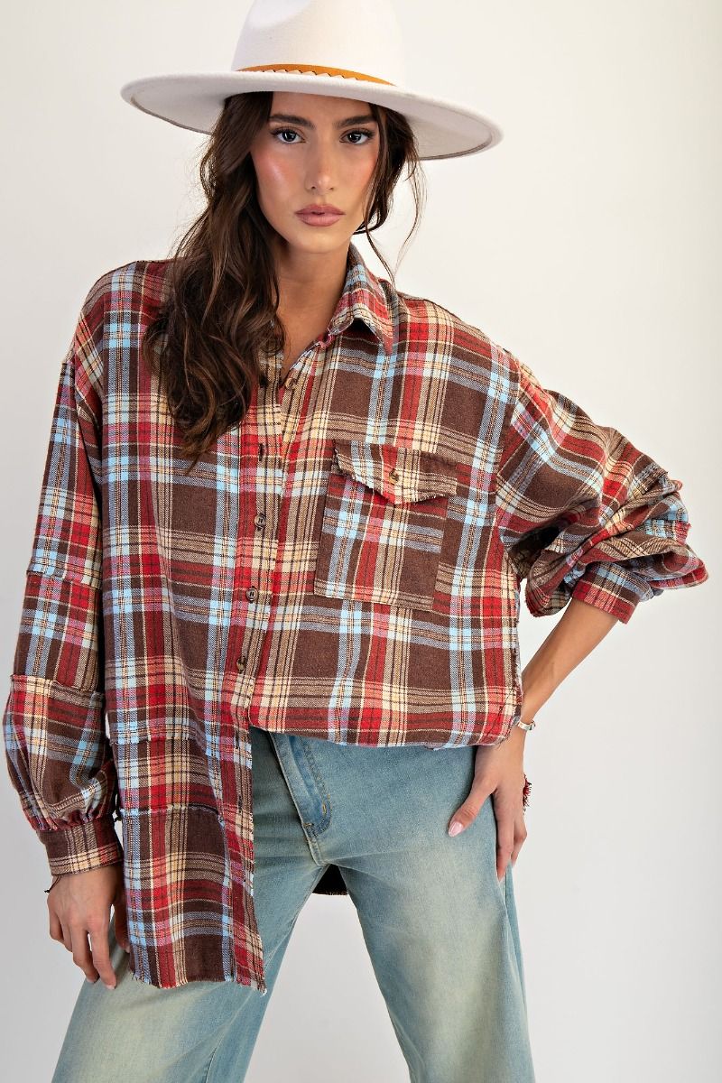 Cozy up in this oversized mocha plaid tunic, designed with relaxed drop shoulders for an effortlessly cool vibe. Perfect for layering, this flannel top adds a playful twist to your casual look while keeping you warm and comfy all day long. Embrace the laid-back charm of fall style with every wear!