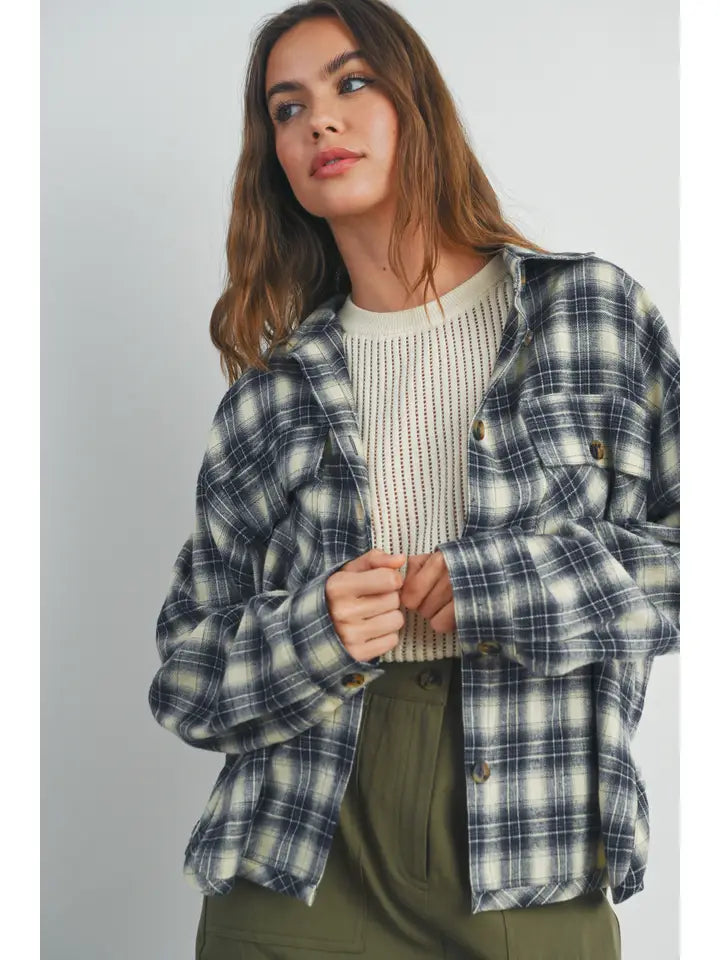 The Navy Plaid Long Sleeve Shirt Jacket is a stylish and versatile garment perfect for various occasions. Crafted with a classic plaid pattern, this shirt jacket combines the comfort of a shirt with the warmth and functionality of a jacket. It features a button-up front closure, long sleeves, and a shirt collar for a timeless look. Made from high-quality materials, it offers a balance of durability and comfort. Whether worn as a lightweight jacket or layered over a shirt, this Navy Plaid Long Sleeve Shirt Jacket adds a touch of sophistication to any outfit. 100% COTTON