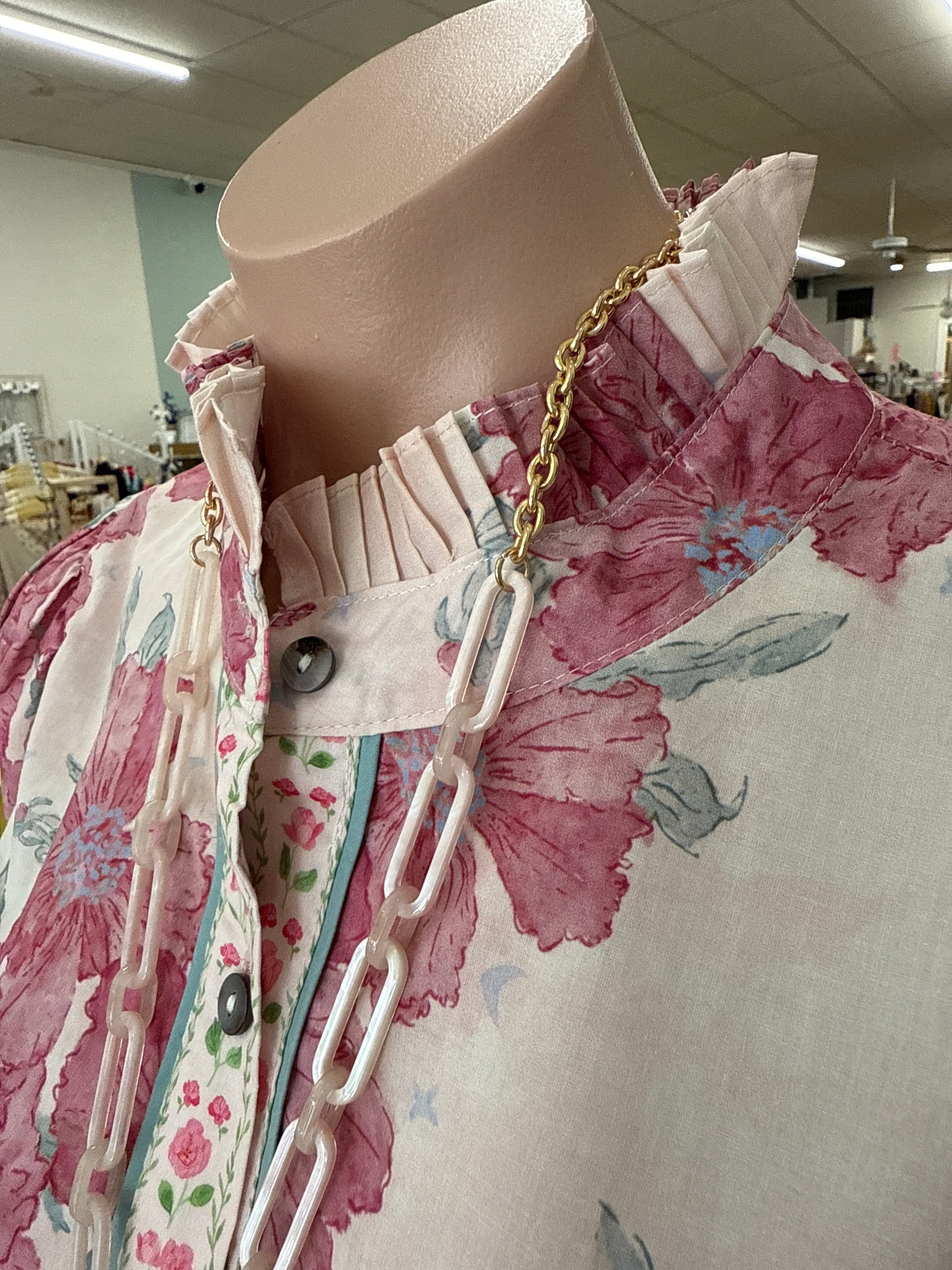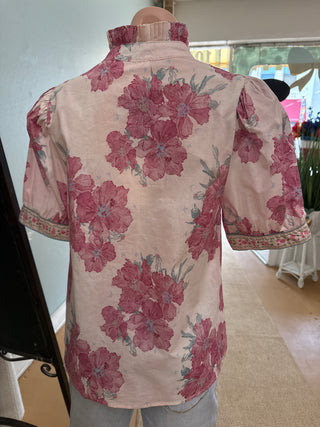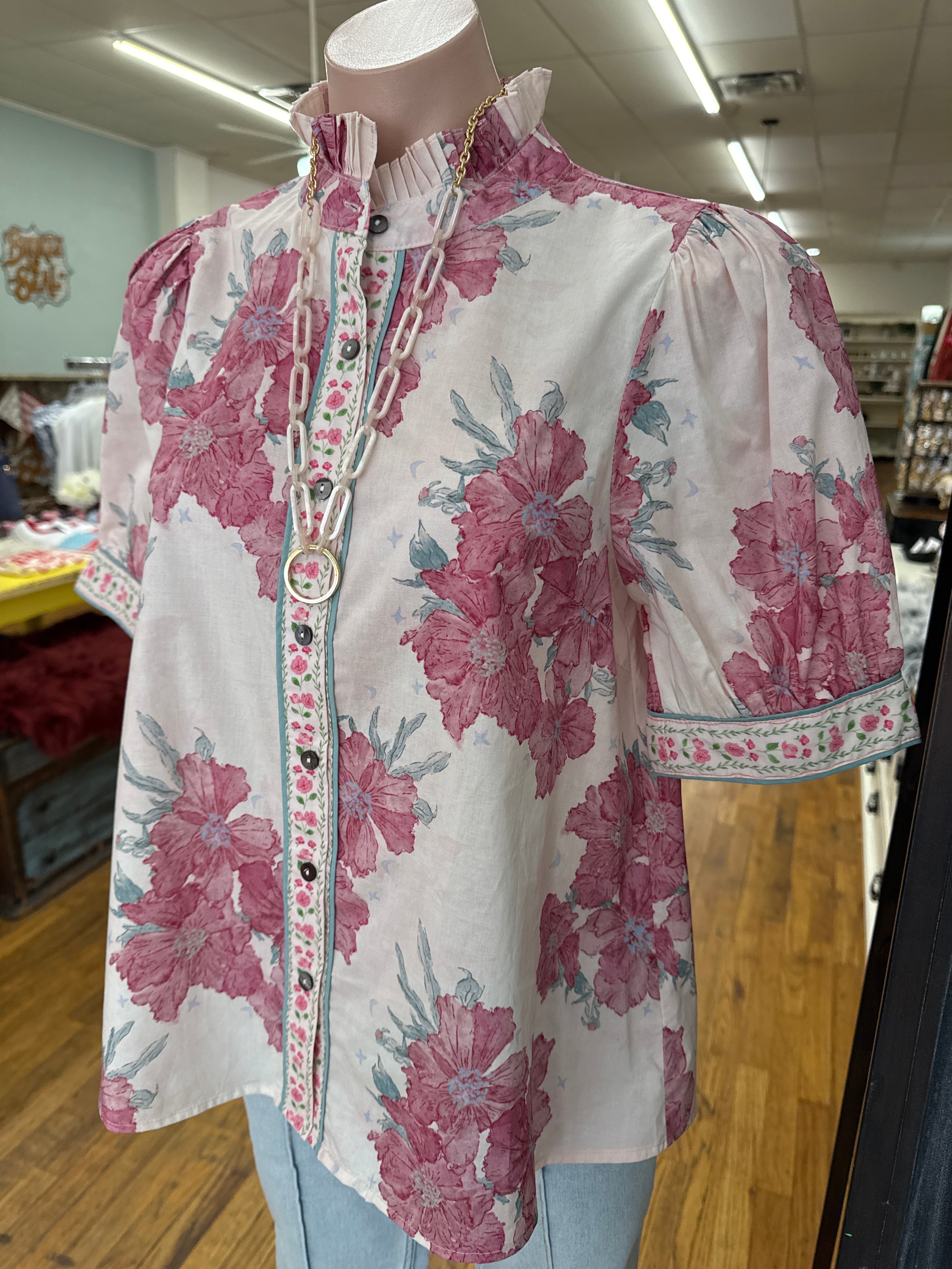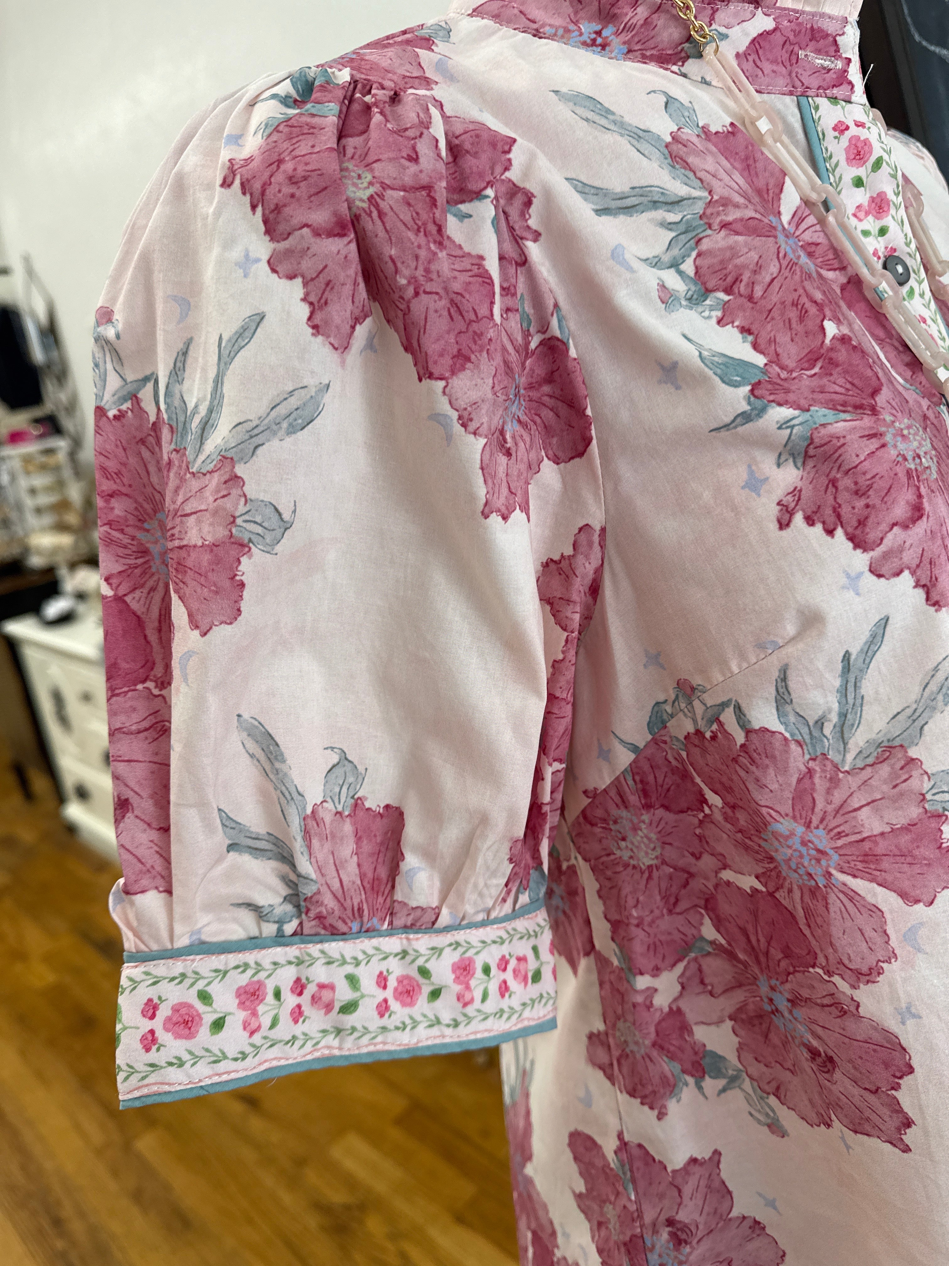 Bloom into summer with this gorgeous Pastel Pink Floral Top. The delicate pink and green floral print adds a touch of femininity, while the lightweight cotton fabric keeps you cool and comfortable. The button up design makes it perfect for any summer occasion. Say hello to your new summer staple!