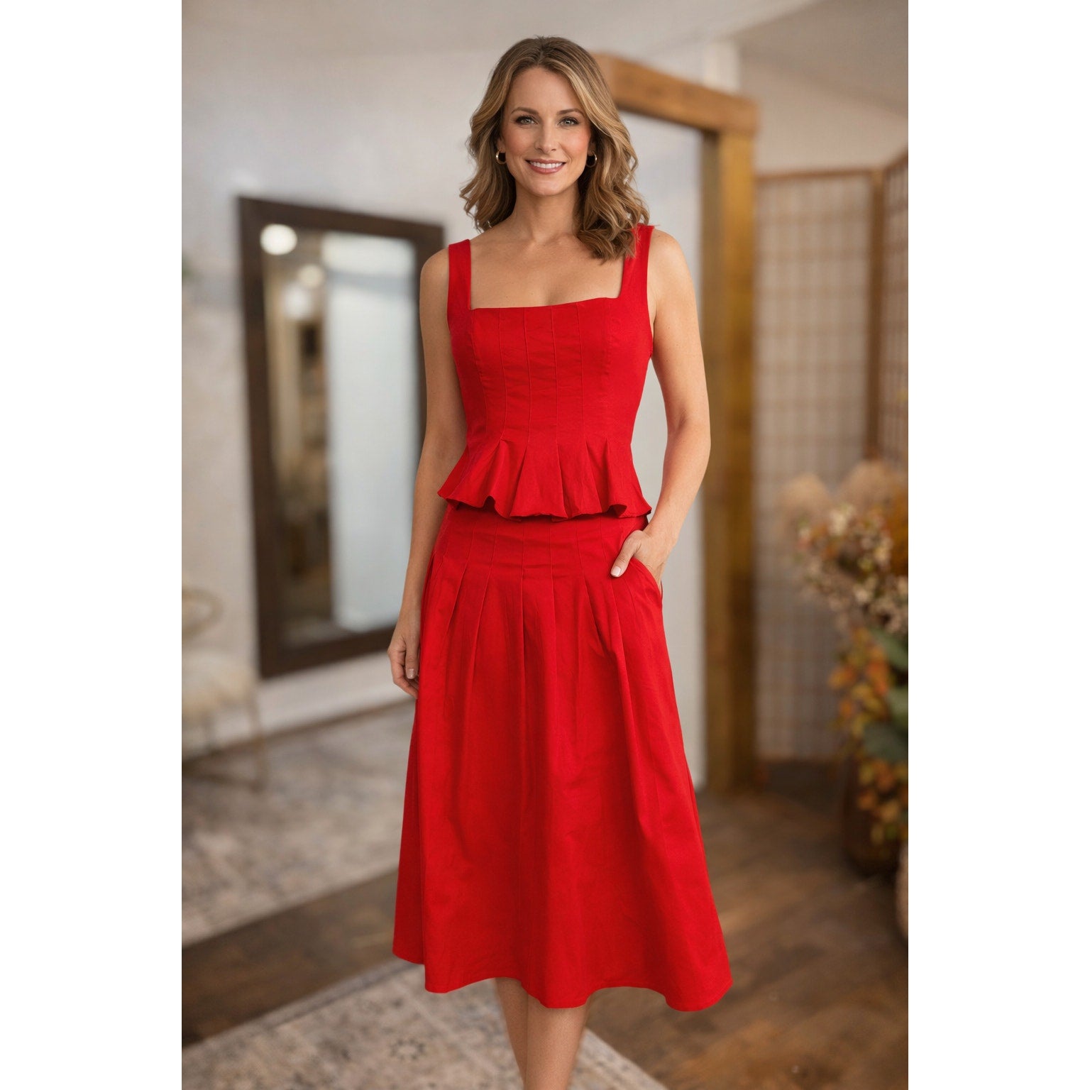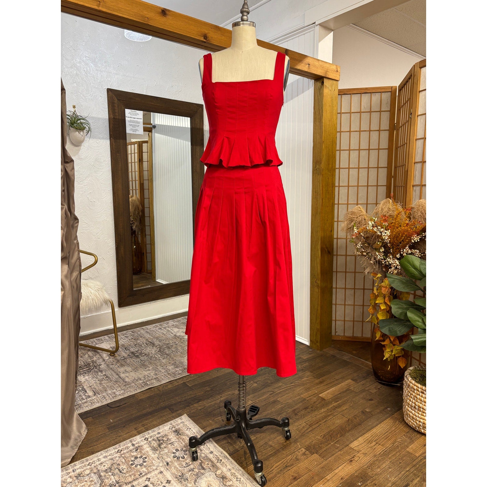 Chic red dress set by Aqua. Includes a sleeveless top and elegant skirt. Ideal for events.