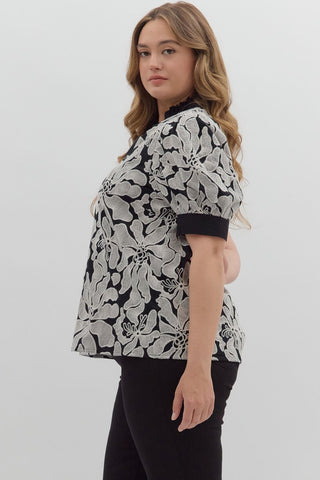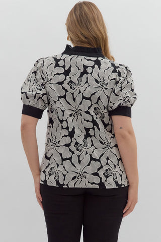 Floral embroidered short puff sleeve pullover top featuring pleated band collar split V-neck.