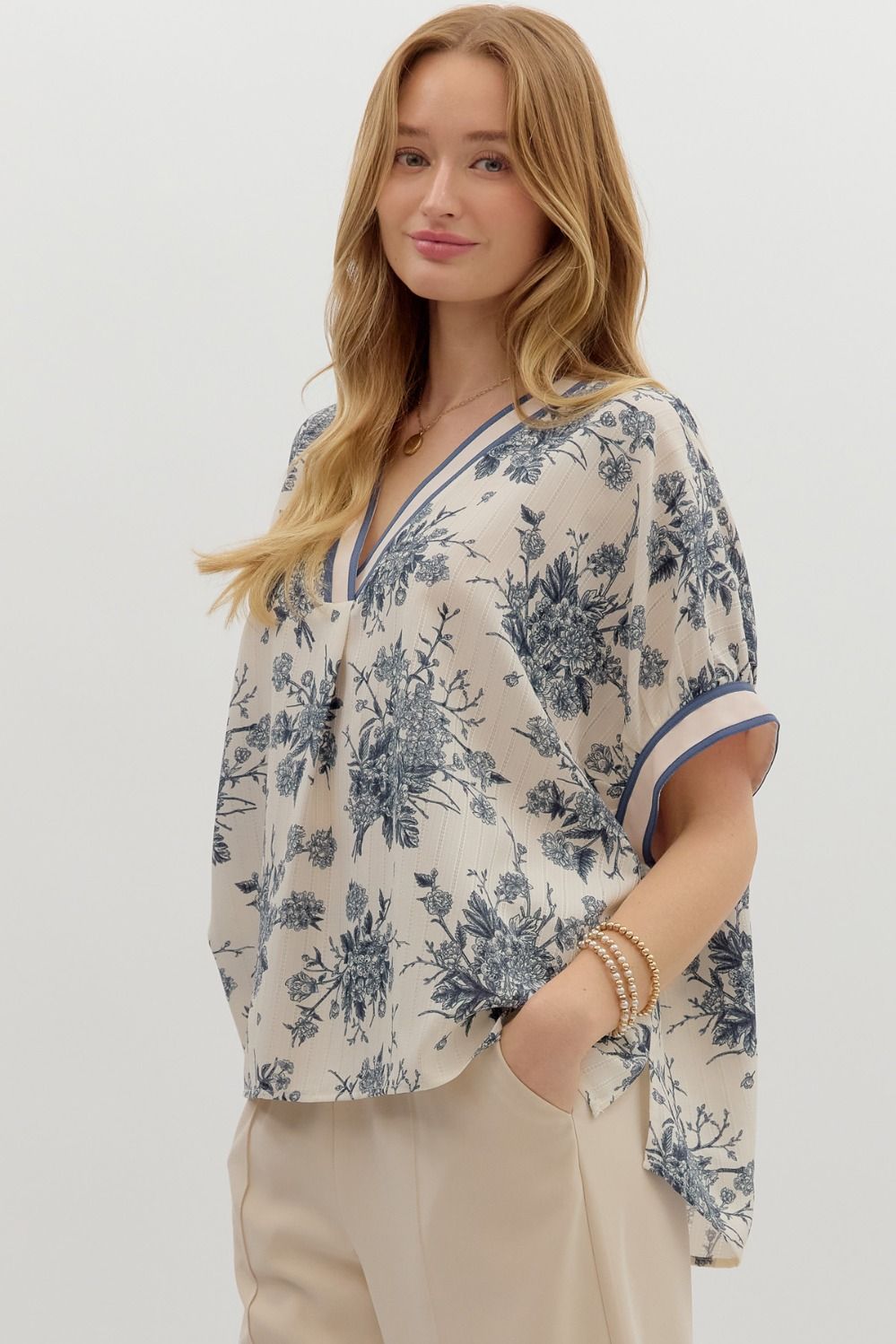 Floral print oversized pullover short dolman sleeve top featuring multicolor band.