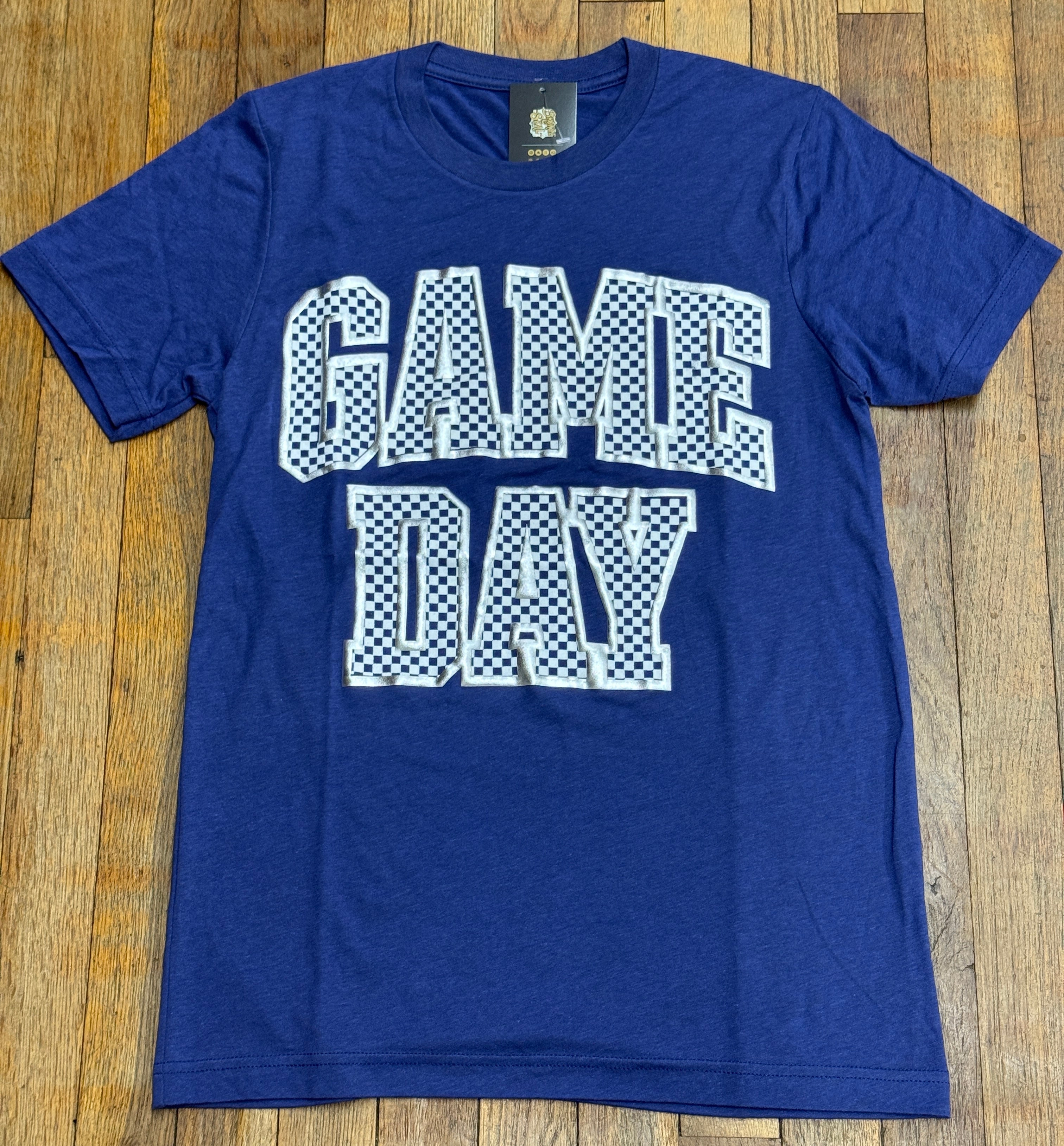 Get ready to score style points with the Checkered Game Day Tee! This fun, heathered navy soft tee features a trendy checkered pattern that brings energy to every sports celebration. Comfortable and playful, it's perfect for fans who want to show off their game day spirit with a splash of flair. Cheer loud, look sharp, and enjoy the game in this must-have tee!