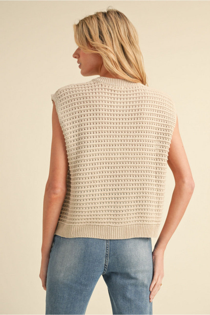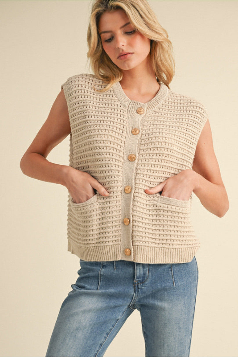 Crochet knit sweater vest. Pair with jeans, shorts, skirts & all the things. You can wear alone buttoned up or unbuttoned & open layered over another top.