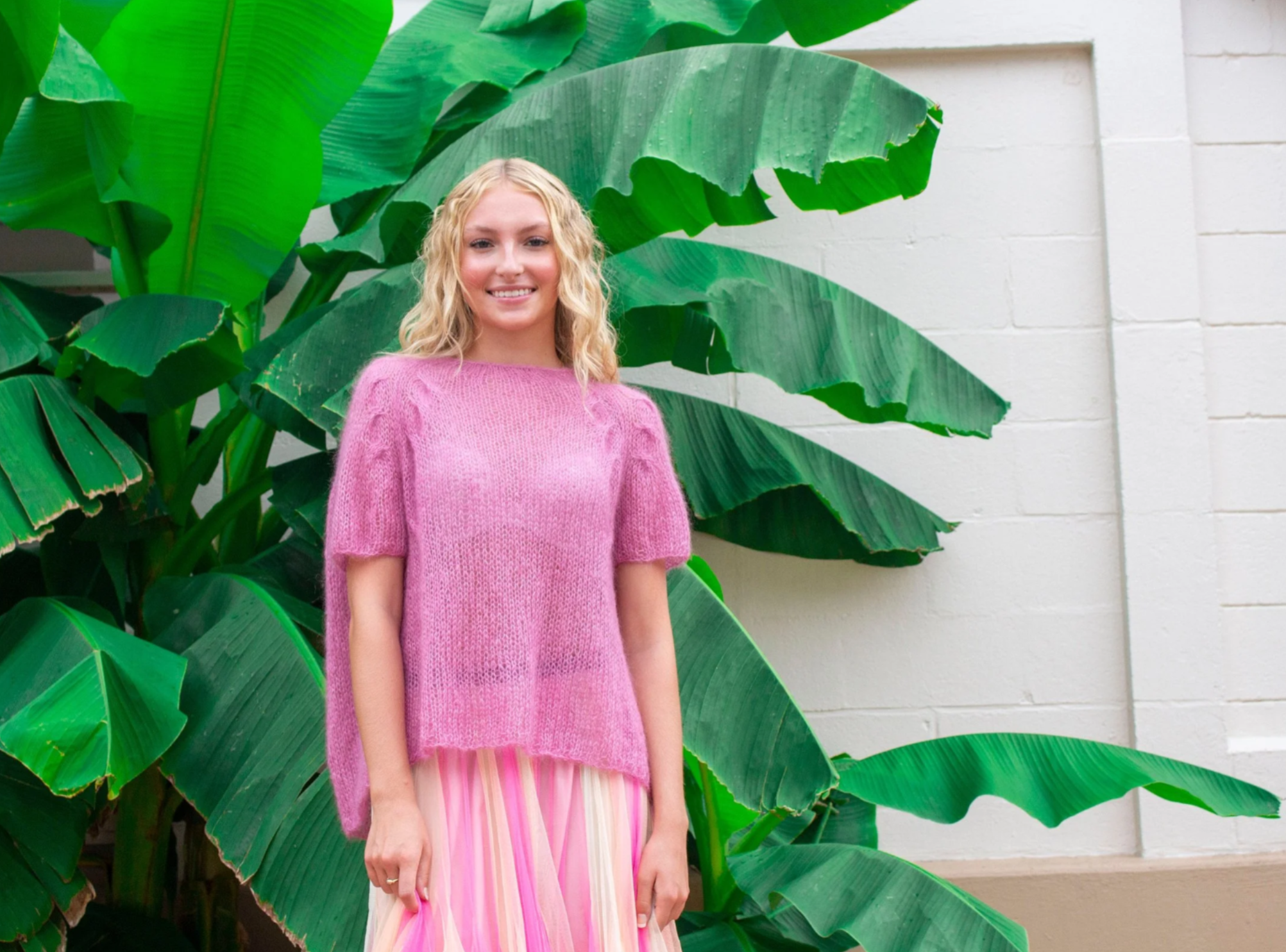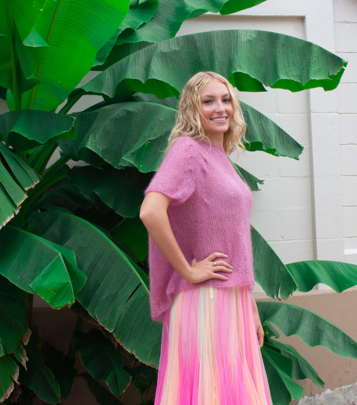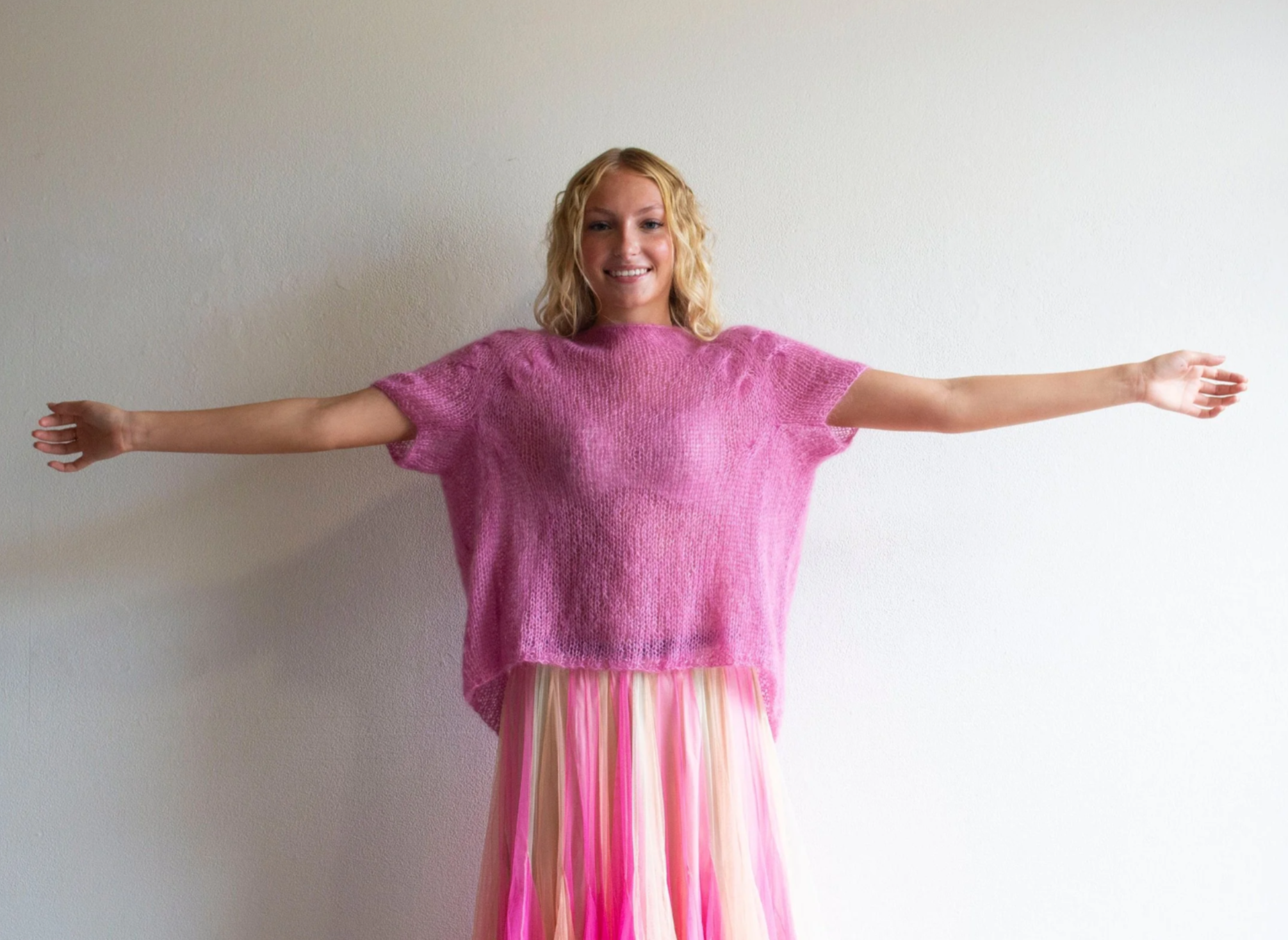 This beautiful, lightweight sweater is hand-knit from 100% silk mohair. It is unique and one of a kind. You will never find another one anywhere.