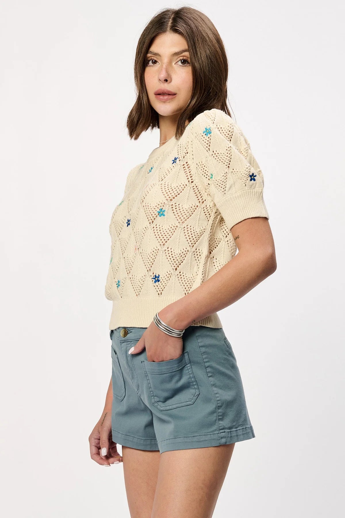 The essence of grace with the Julia sweater in vintage cream, a short-sleeve, open-knit design crafted from breathable 100% cotton yarn for ultimate comfort. This versatile outfit effortlessly combines floral detailing with timeless style, making it the perfect choice for any occasion from casual days to chic nights.