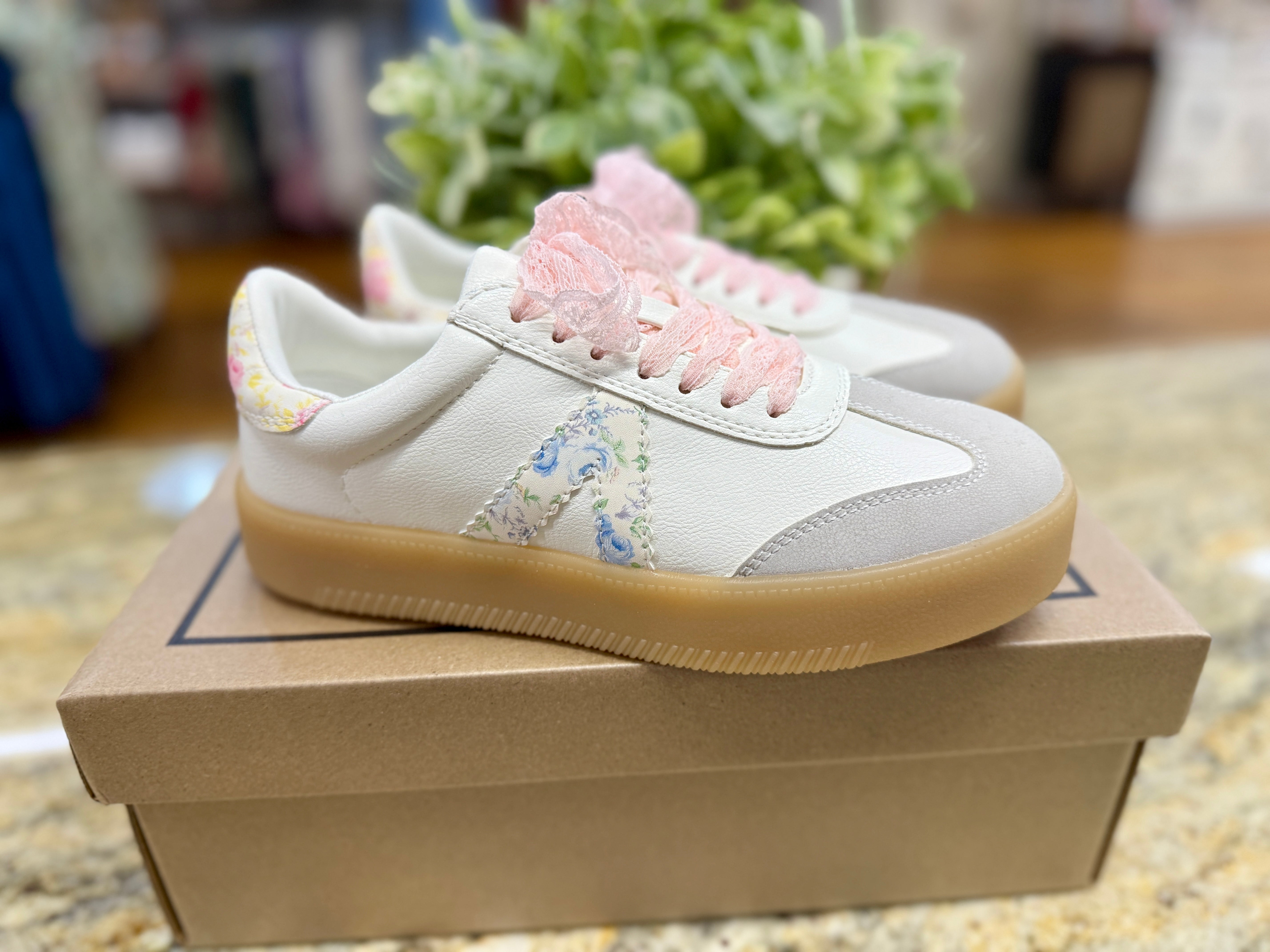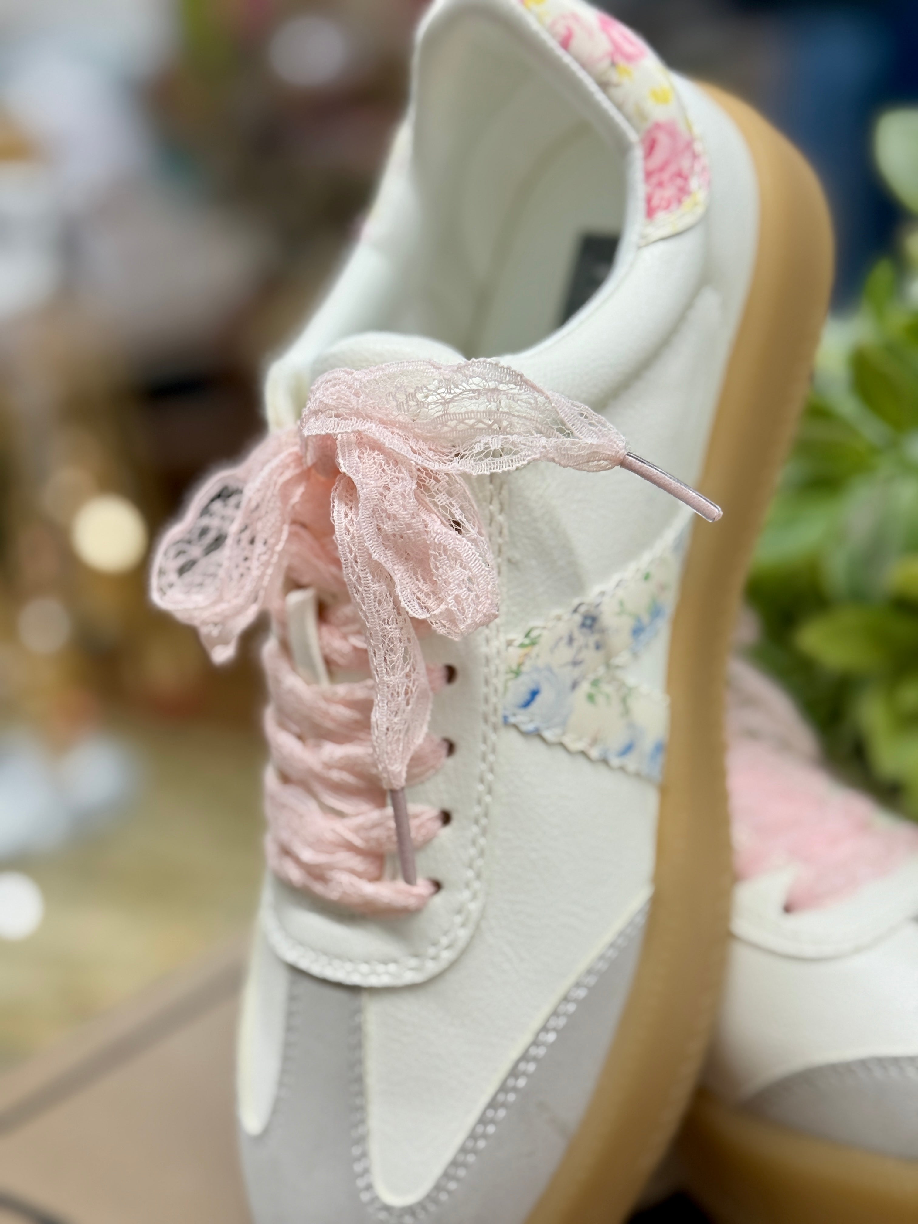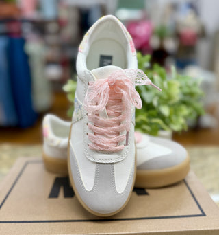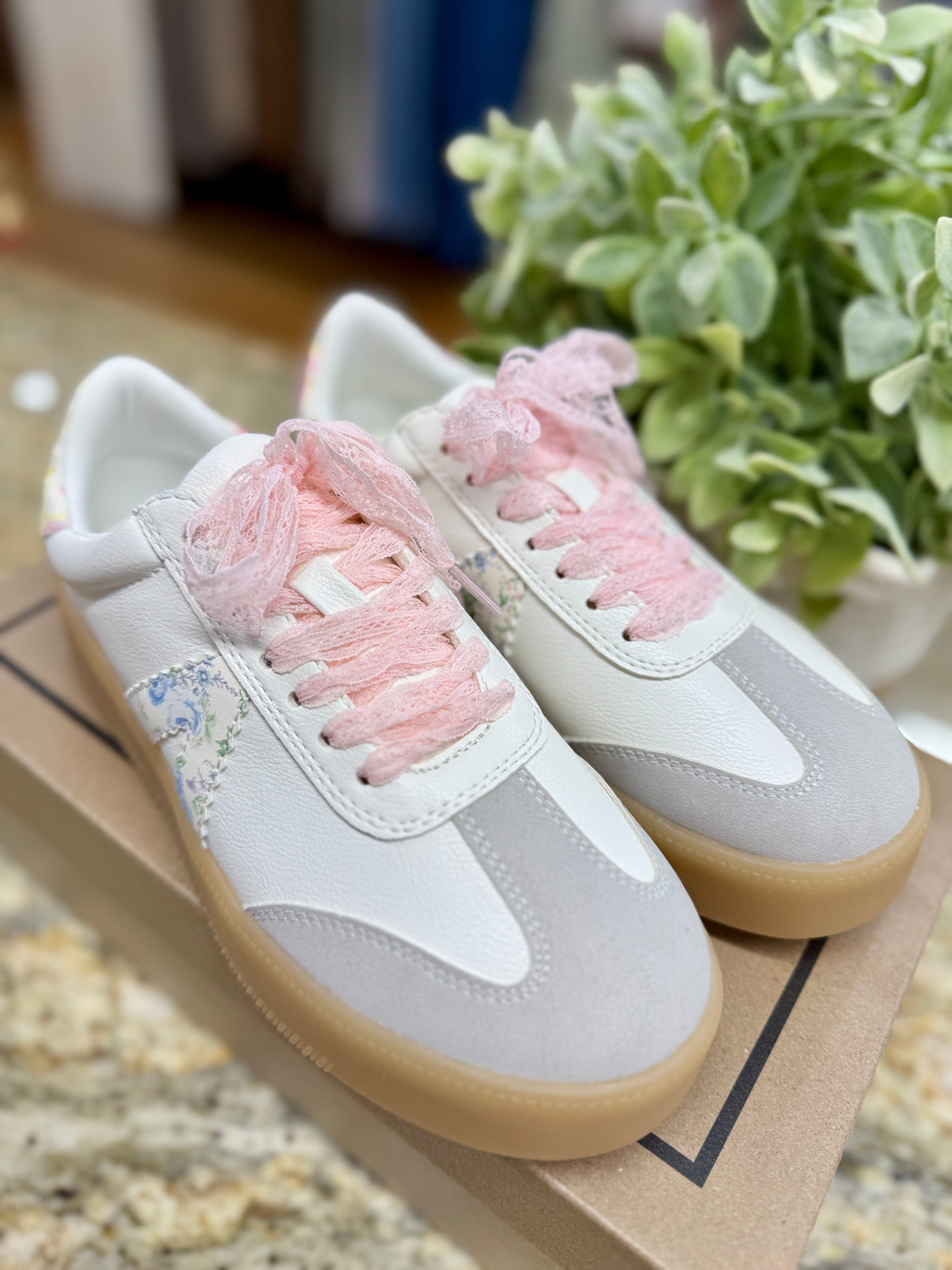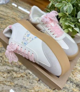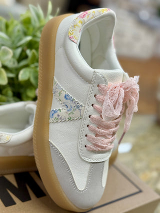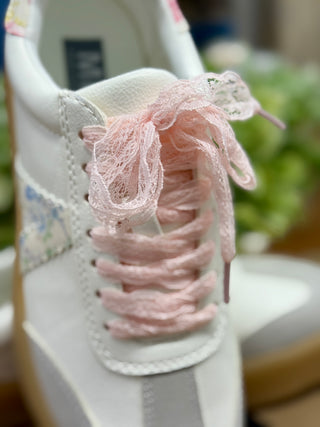 The perfect casual sneaker! Neutral colors and a pretty floral stripe, feminine pink lace shoelaces have us wanting to show off these sneakers every time we step out!
