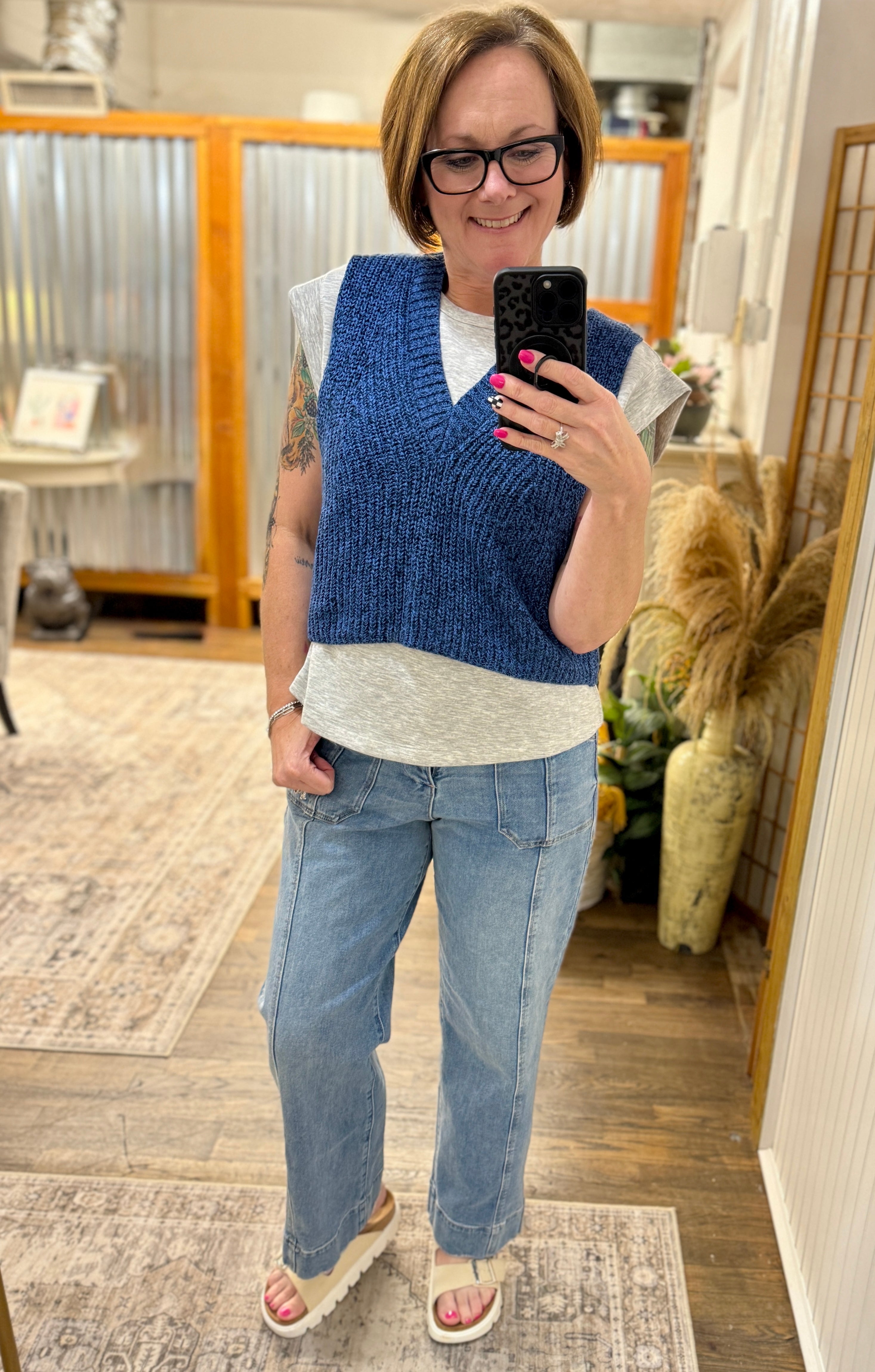 Twofer navy pullover with grey v-neck cap sleeve knit top.  This is literally two tops.  The navy sweater vest is tack sewn to the grey knit top.  You can easily just cut the tack.