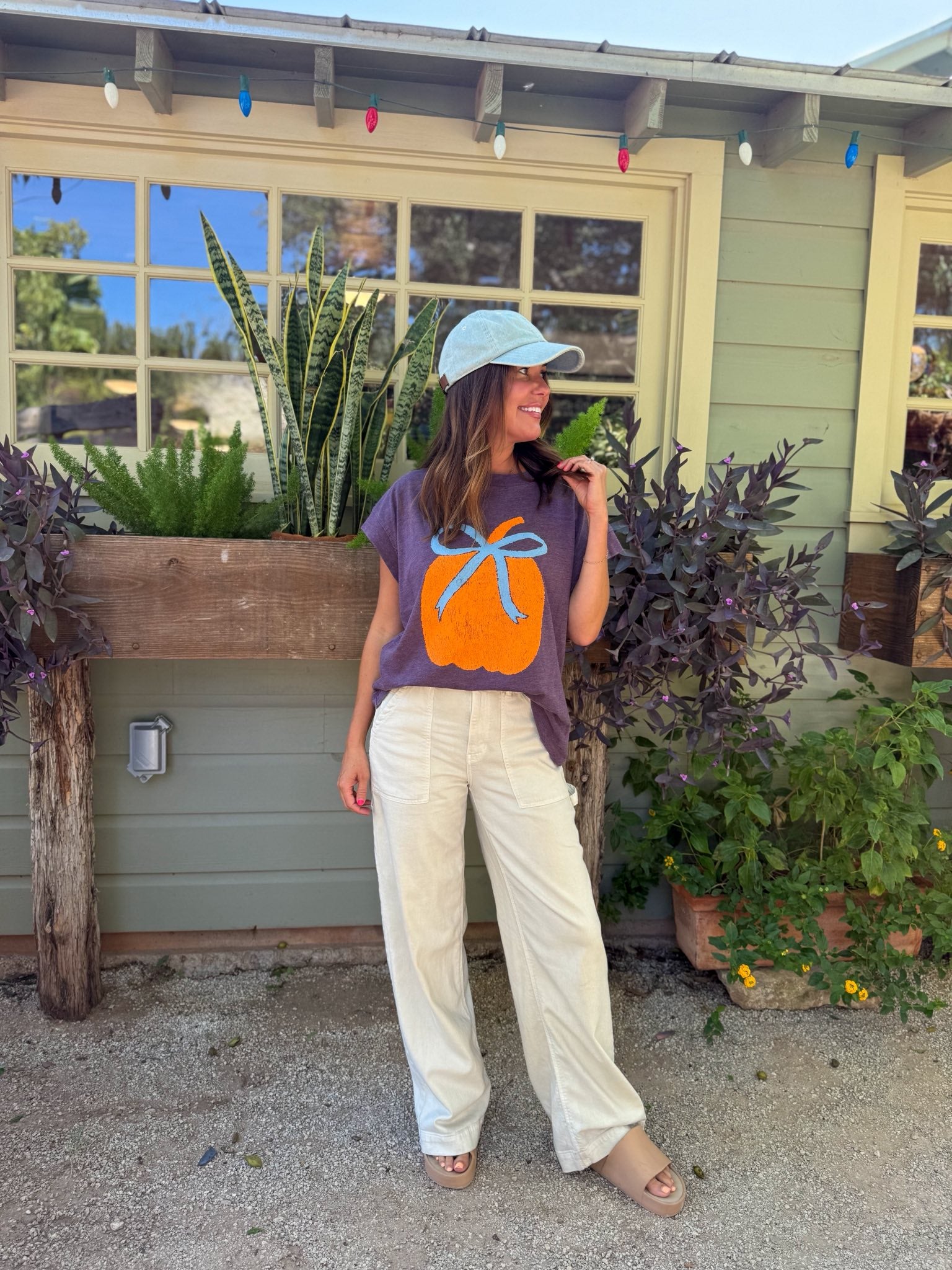 Fall Pumpkins can be on a plum tee! Why not be different? This plum-colored tee is a little thicker than your usual tee and has drop shoulders with a slight cap sleeve.