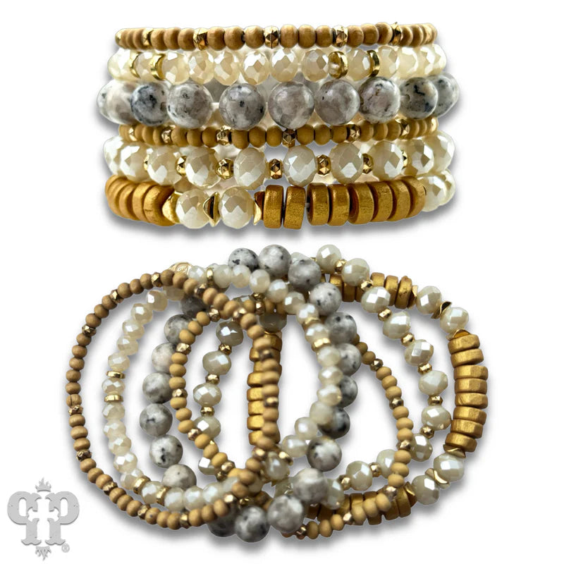 Natural textures and earthy tones set apart this artsy look bracelet. The set stretches for ease of wear.